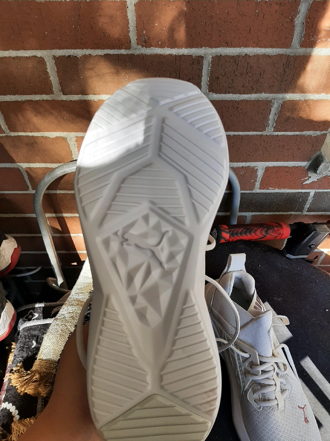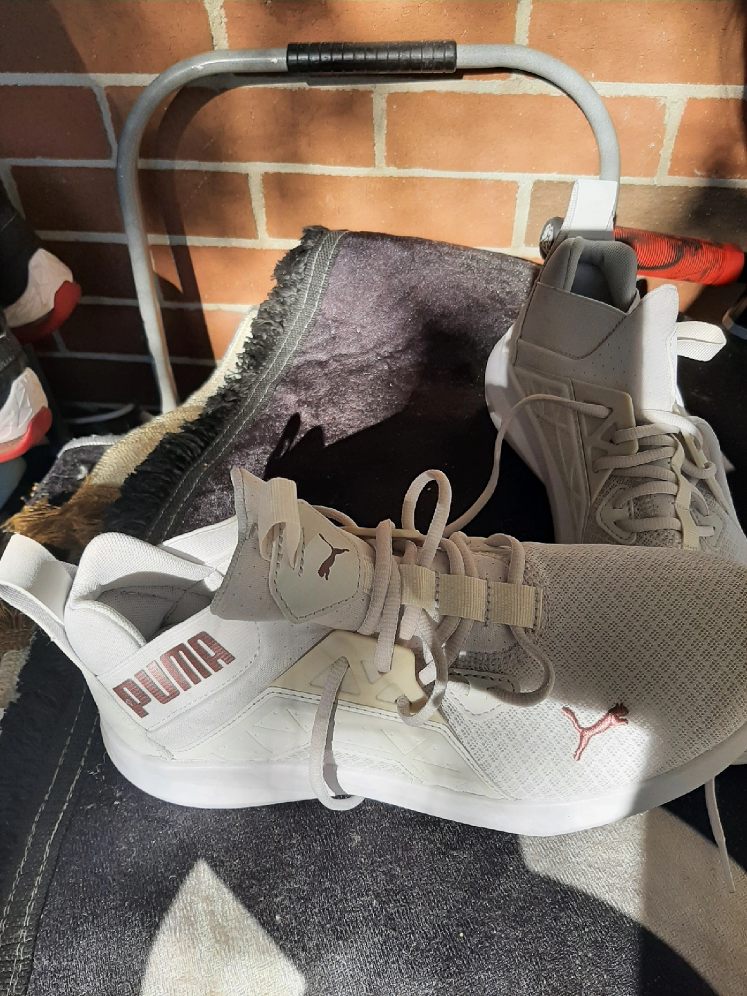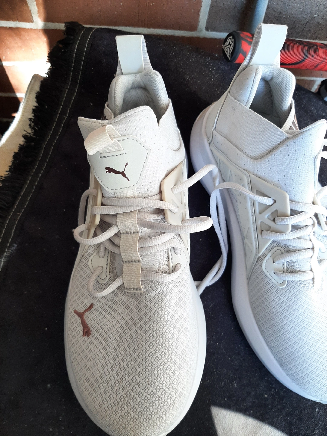 Selling a pair of Puma running shoes with SoftFoam optimal comfort. These are women's size 9. They are white with a maroon Puma logo. Perfect for running or everyday wear!