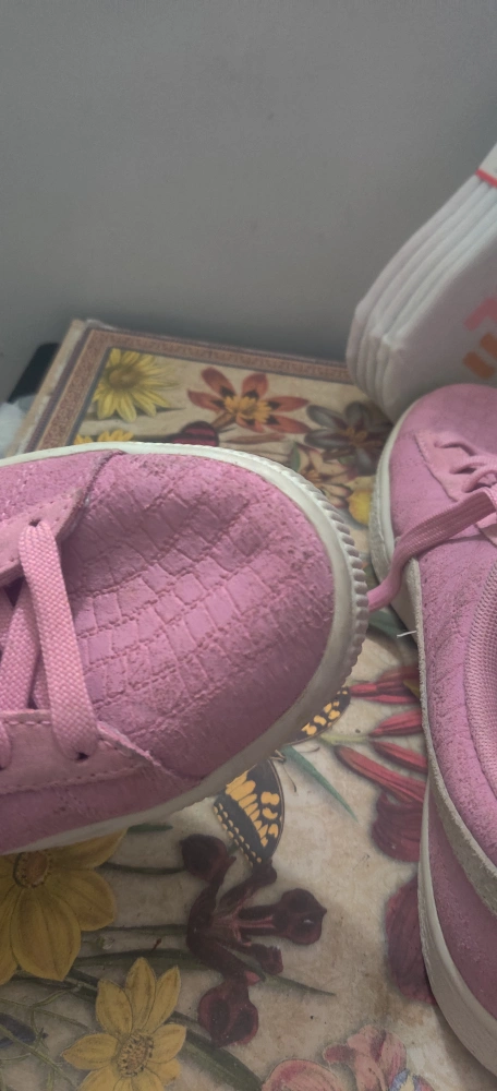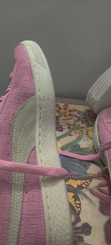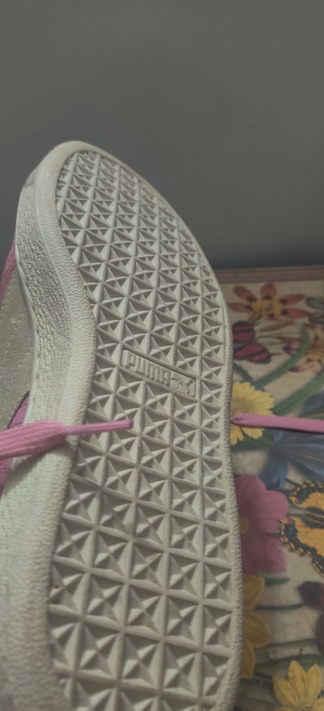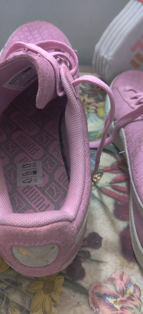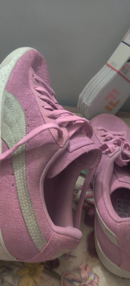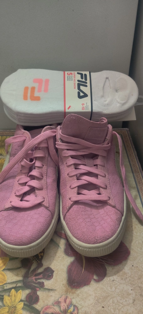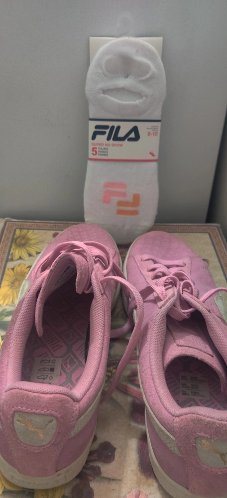 1000+Selling a pair of Puma Suede sneakers in pink! They have a classic look and are made with a suede material. Perfect for adding a pop of colour to your outfit. Also included is a pack of Fila socks size 6-10. Shoes havent been worn but got soiled from storage. Price is firm