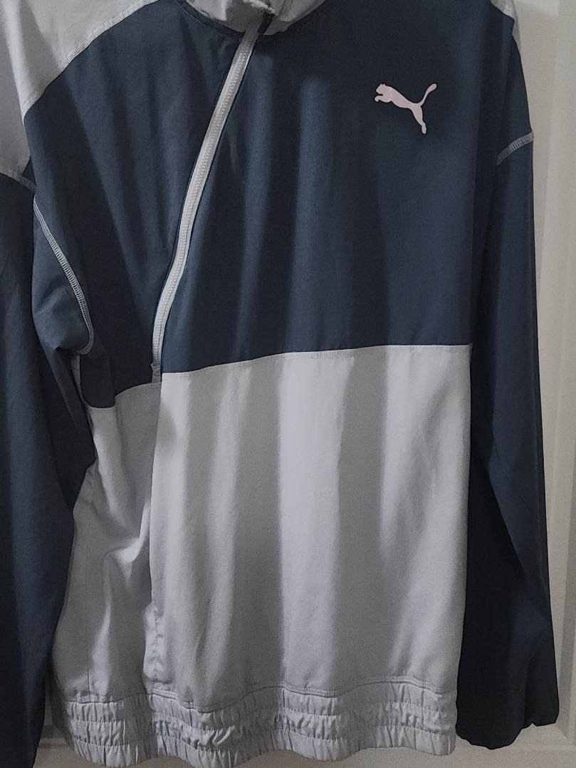 83Here's a Puma jacket in a stylish two-tone design! It features a unique asymmetric zipper and the classic Puma logo. Perfect for adding a sporty touch to your wardrobe!