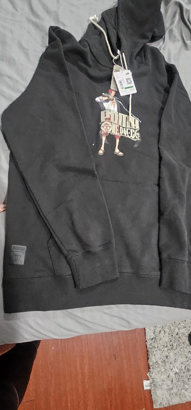 Selling a Puma hoodie from the One Piece collaboration. It's a size large and in great condition. The design features Shanks from One Piece, blending the Puma logo with the One Piece theme. Perfect for any fan of the series!