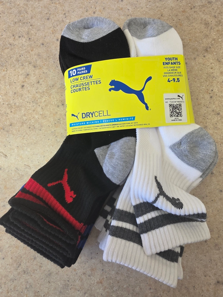 10Selling a pack of brand new Puma youth low crew socks! These socks fit shoe sizes 4-9.5. They are made with DryCell moisture wicking technology to keep feet dry and comfortable. Each pack contains 10 pairs of socks. brand new