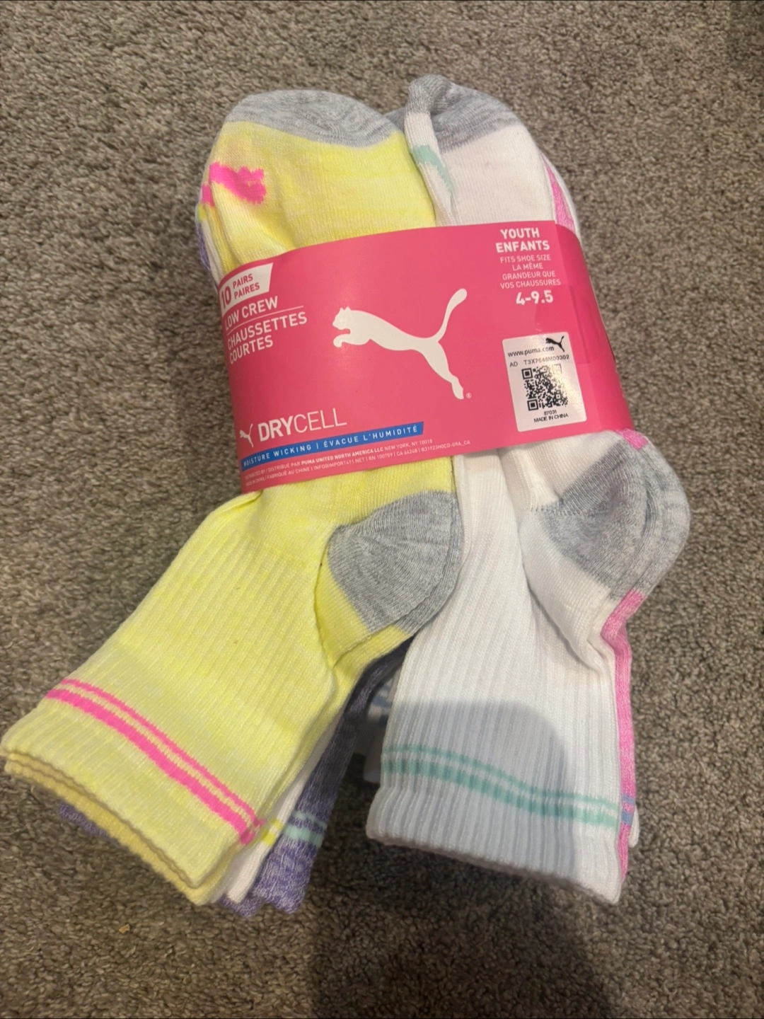 381Selling a pack of 10 pairs of Puma youth socks. These are low crew socks and fit shoe size 4-9.5. They feature Drycell moisture wicking to keep feet comfortable New Smoke free pet free home Pick up can be Rathburn and the west mall area Or Symington and DuPont