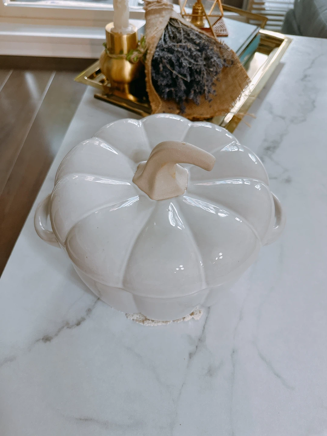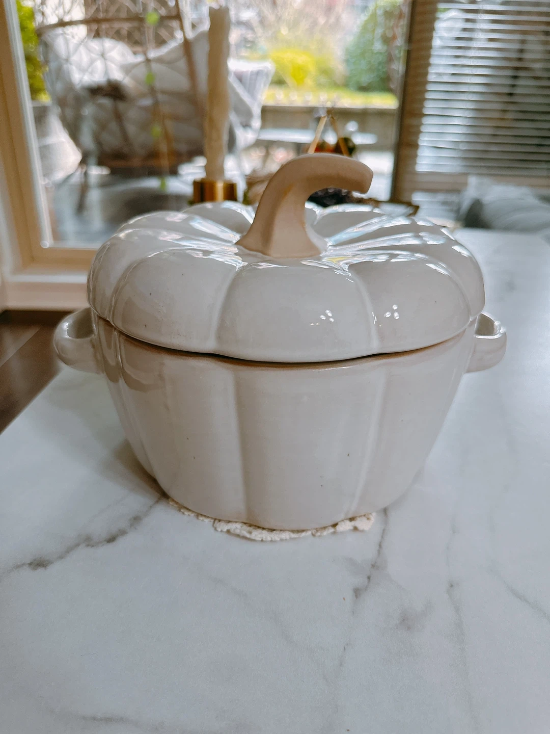 5Brand new with tags! Beautiful creamy white pumpkin shaped casserole dish~ Tags on bottom say dishwasher, microwave & oven SAFE! Great quality & heavy dish with handles. 7” Height with lid (4” lid off, just pot) 8.5” diameter Pickup near Edmonds station in Burnaby~