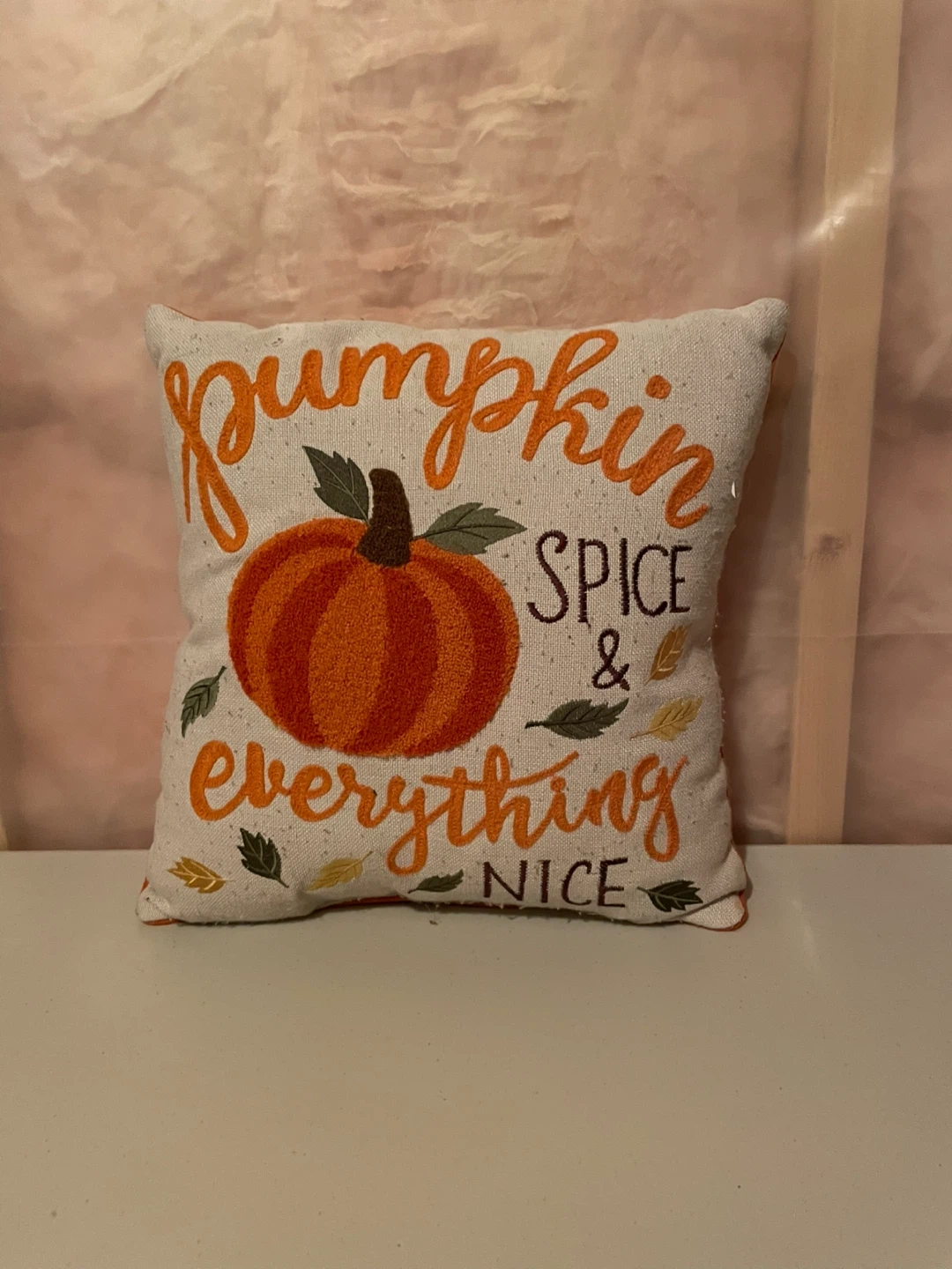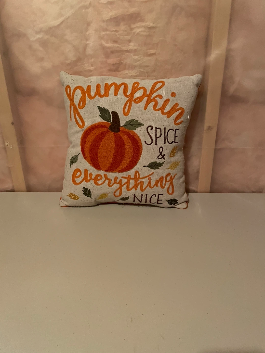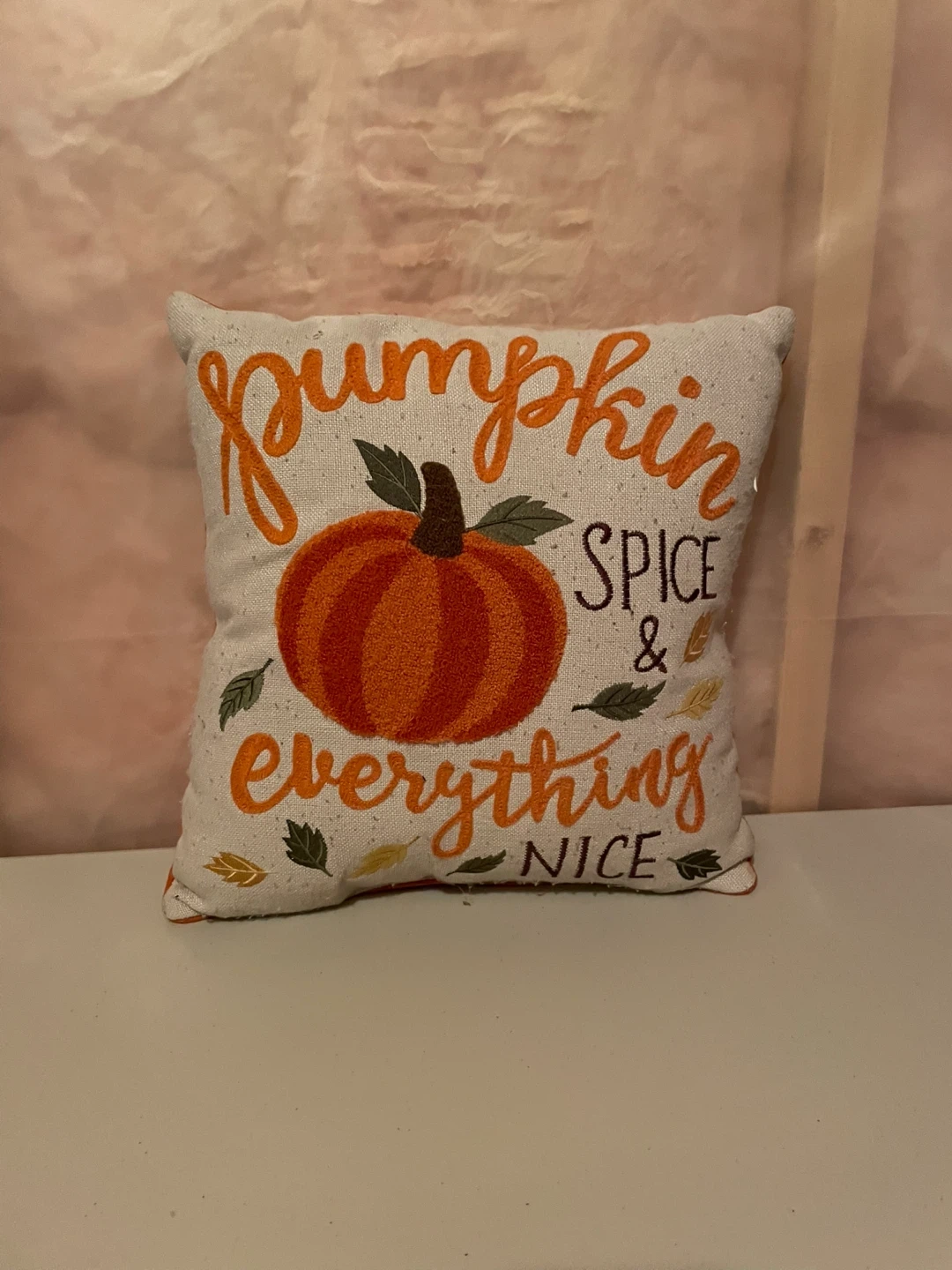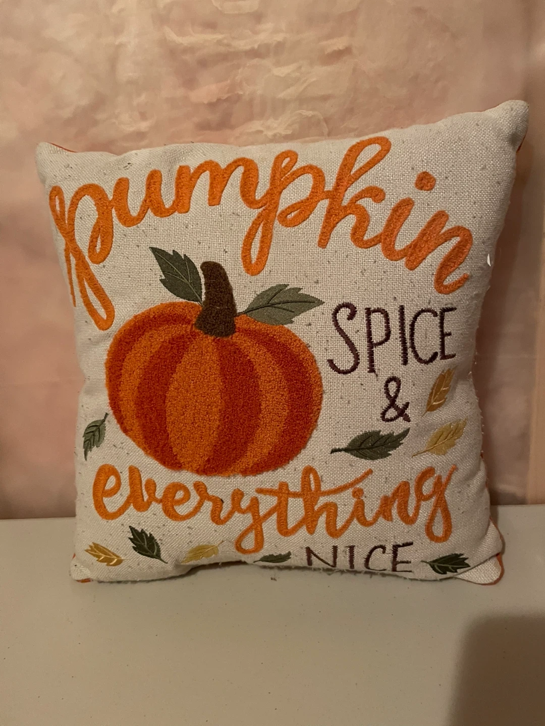 Cute decorative pillow with "Pumpkin Spice & everything Nice" text and pumpkin design. Perfect for fall decor! $20