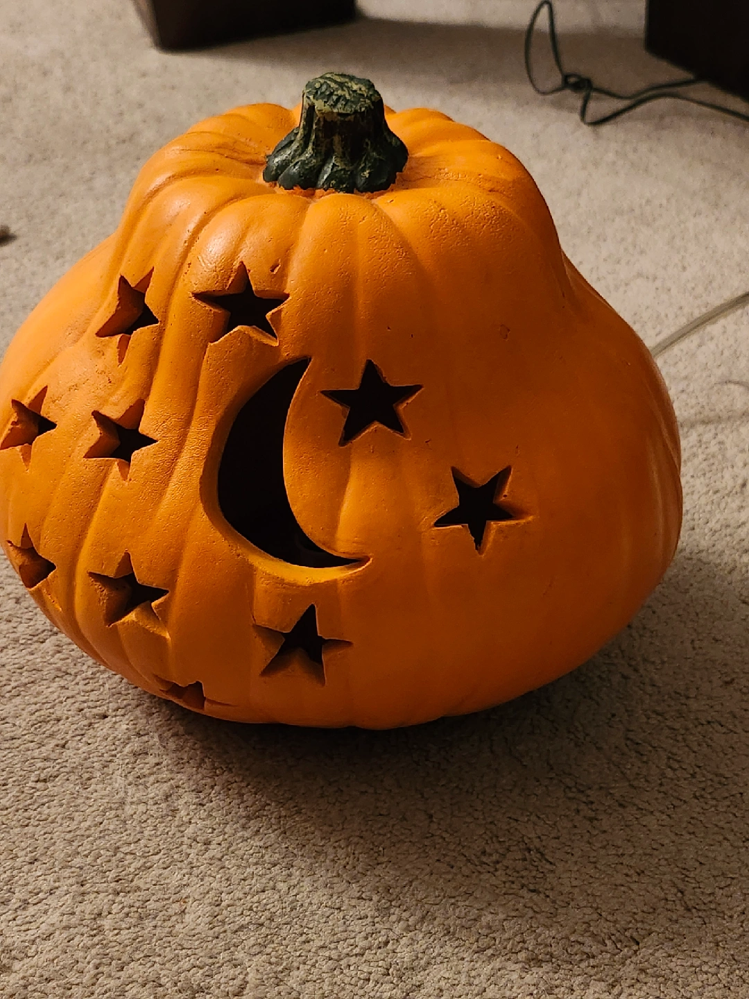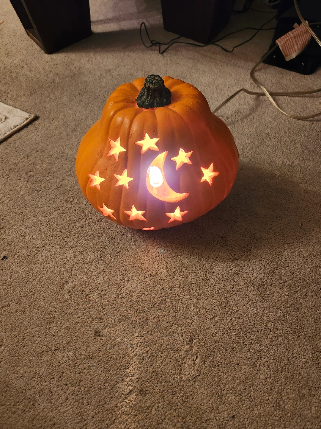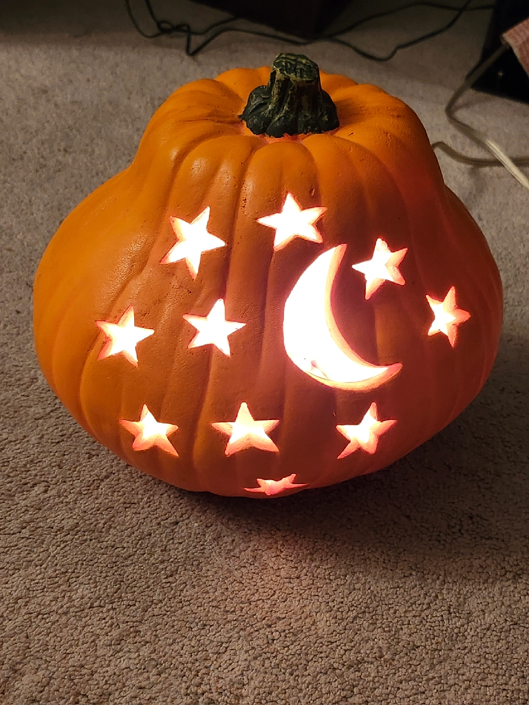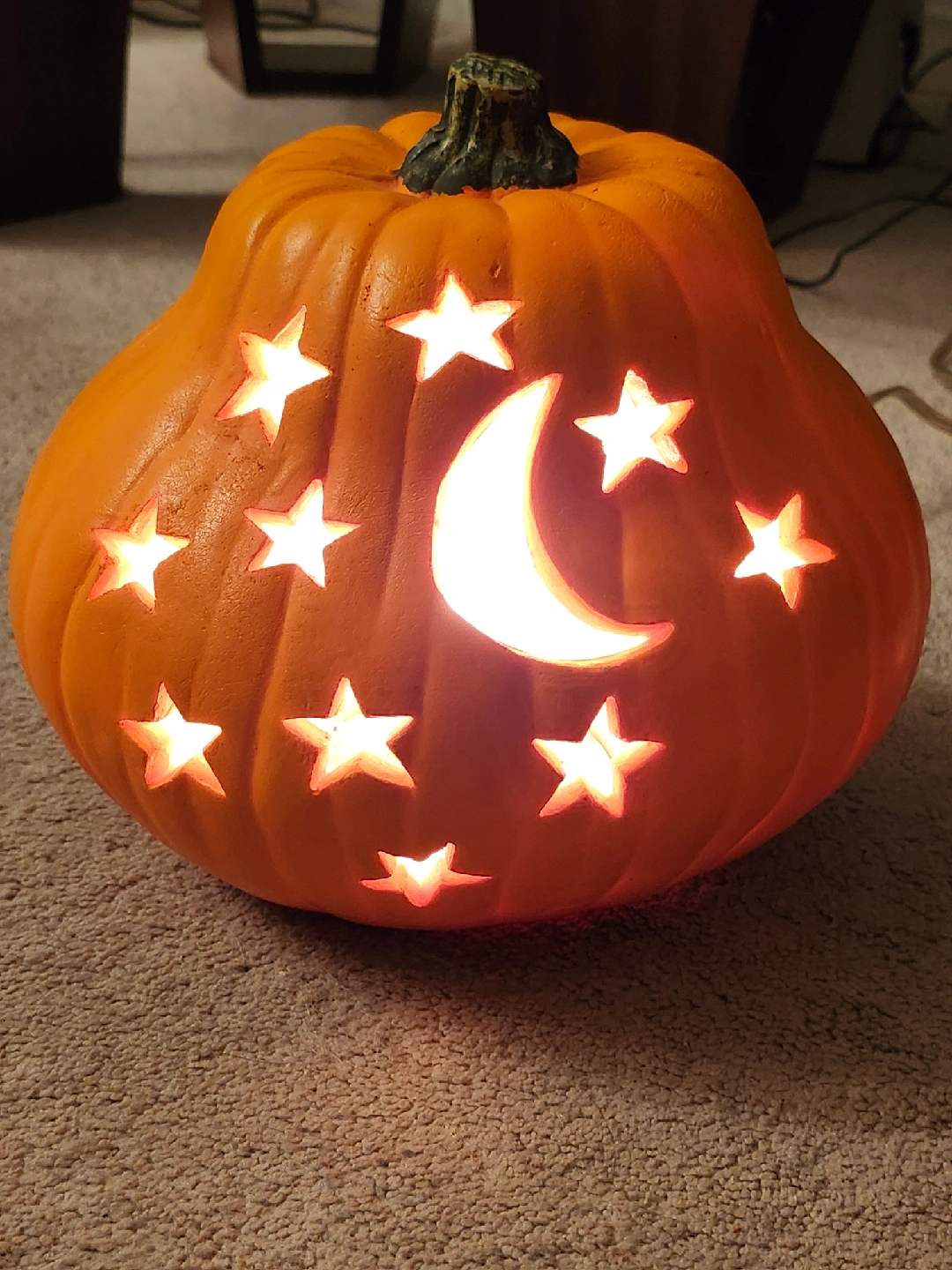 316Cute pumpkin decoration with moon and star cutouts! It lights up to give a warm, festive glow for Halloween or fall decor