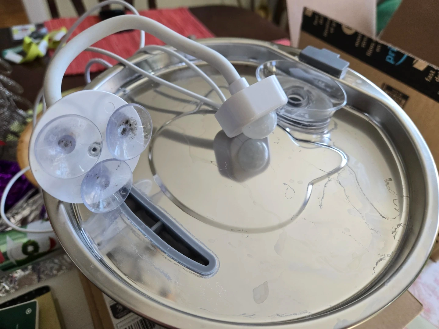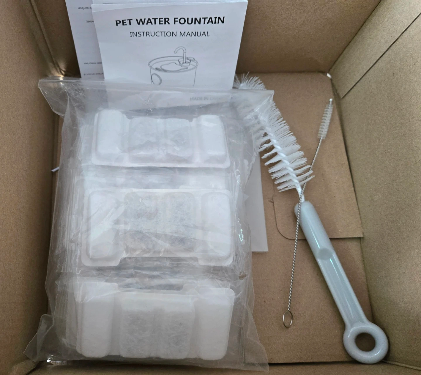 This is a stainless steel pet water fountain with a 3.2L capacity and a round window to see the water level.Stainless steel is so much better than plastic that can be unhealthy for your pet. It features dynamic water flow that's healthier and fun for pets. Includes sensor that I purchased separately, which allows the fountain to turn on and off, 11 filters, that I purchased separately and also cleaning brushes.