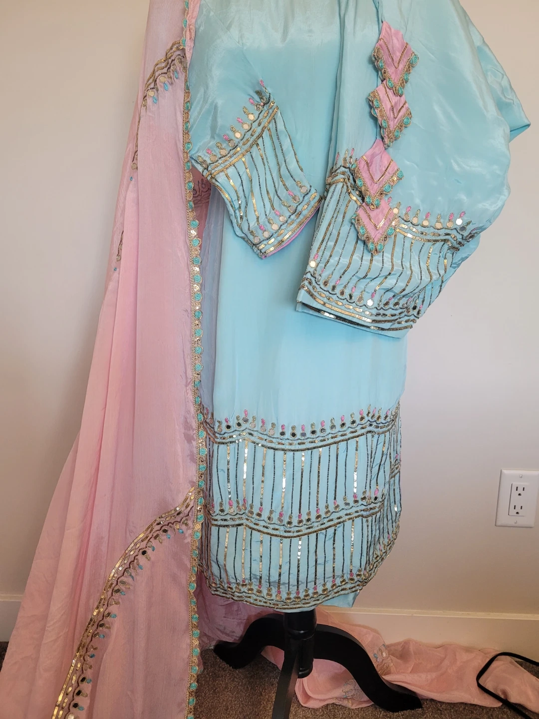 10Beautiful Punjabi suit in sky blue and pink! The suit features intricate detailing with gold sequins and embellishments. Perfect for special occasions or cultural events. The fabric drapes nicely and the colours are vibrant. A stunning addition to any wardrobe!