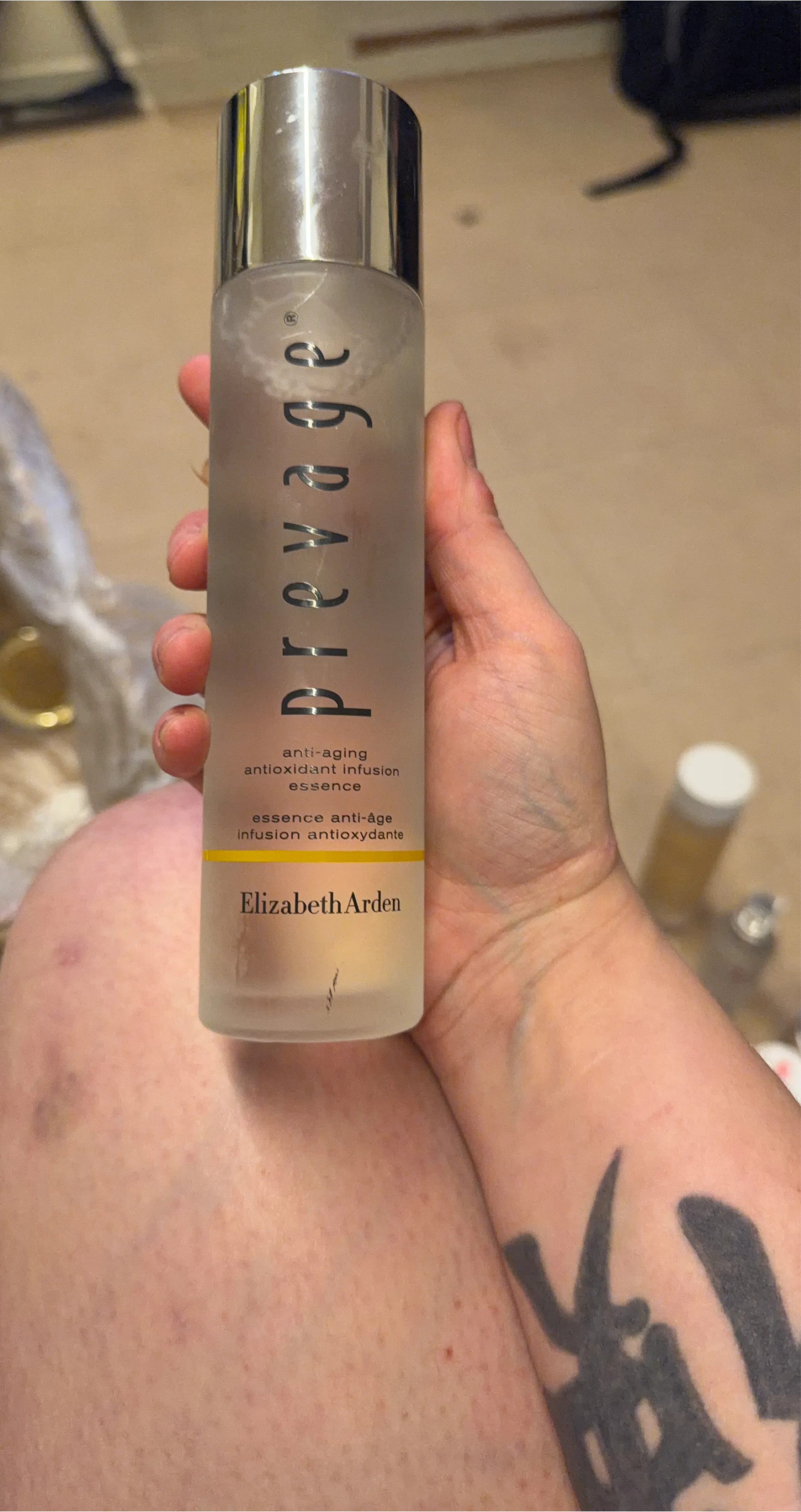 Elizabeth Arden Prevage anti-aging antioxidant infusion essence. This essence is formulated with antioxidants for skin renewal. It's designed to help combat visible signs of aging.