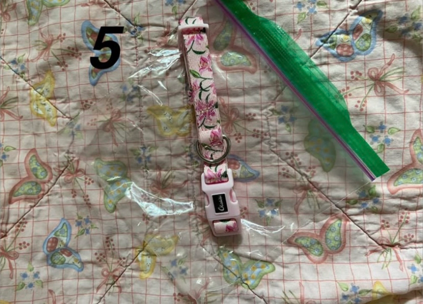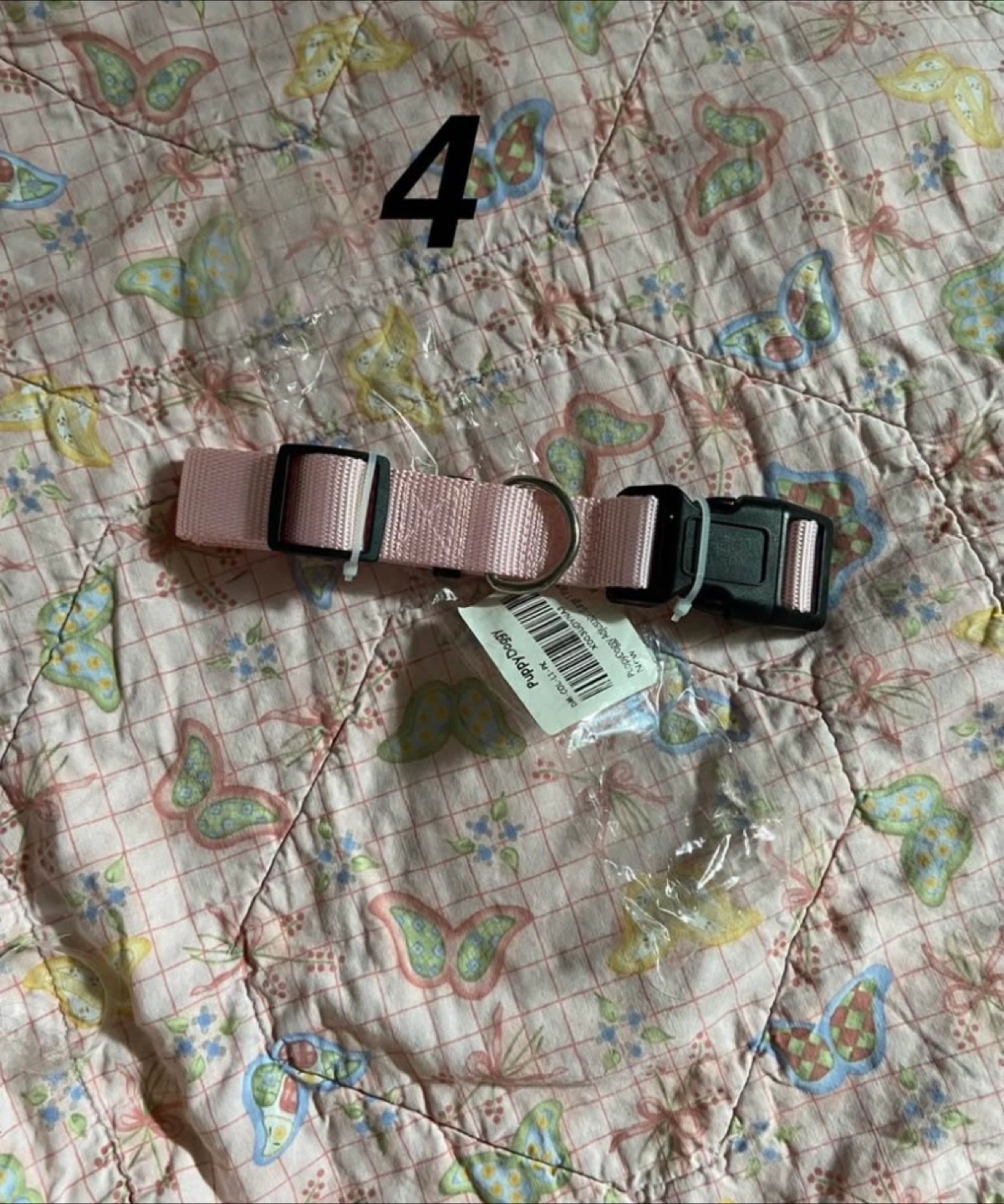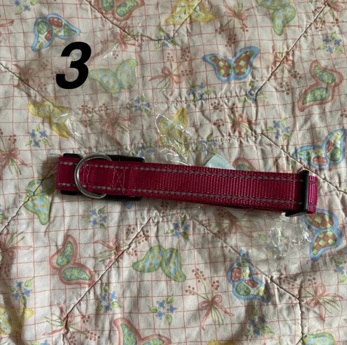 1) Spray Massage Brush for dogs- $3 2) Easter Egg collar- $3 3) Dark red collar, medium or large- $3 4) Light Pink collar, large- $3 5) Pink flower collar, small- $3 6) Purple collar, medium- $3 7) Harness, medium- $3