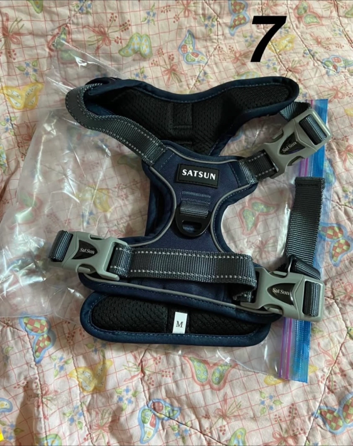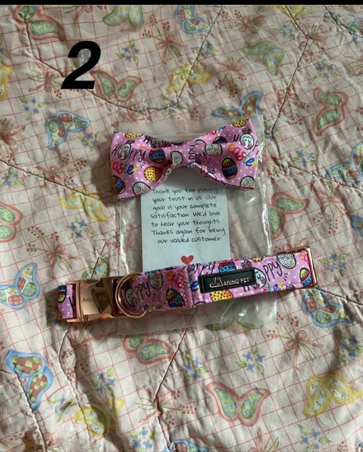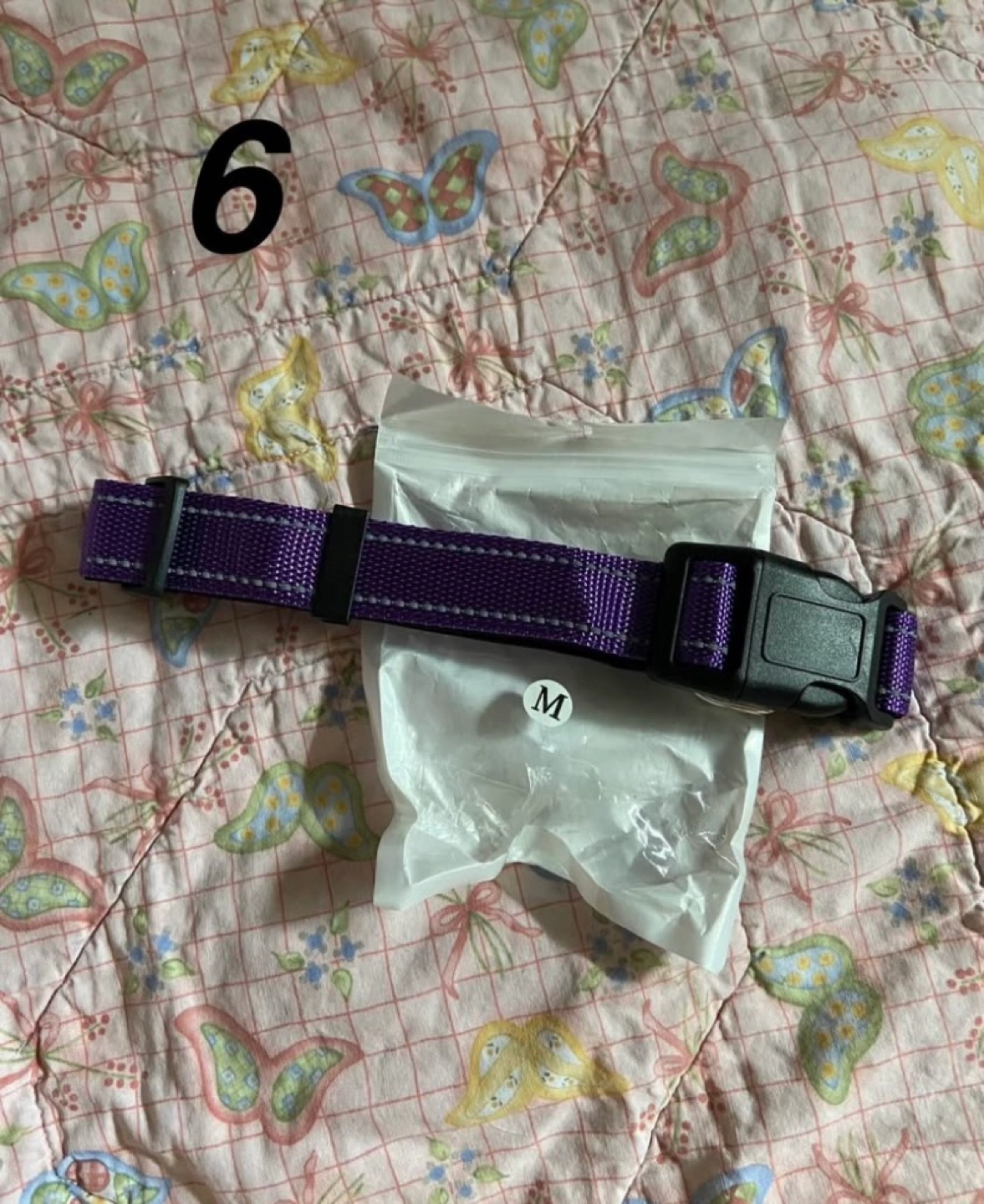 1) Spray Massage Brush for dogs- $3 2) Easter Egg collar- $3 3) Dark red collar, medium or large- $3 4) Light Pink collar, large- $3 5) Pink flower collar, small- $3 6) Purple collar, medium- $3 7) Harness, medium- $3