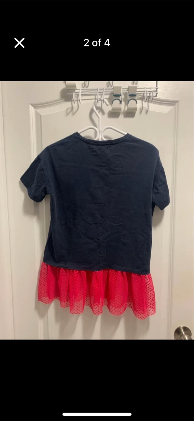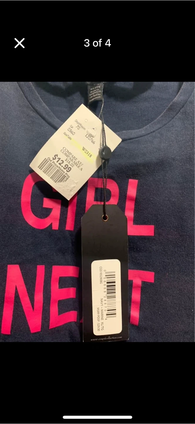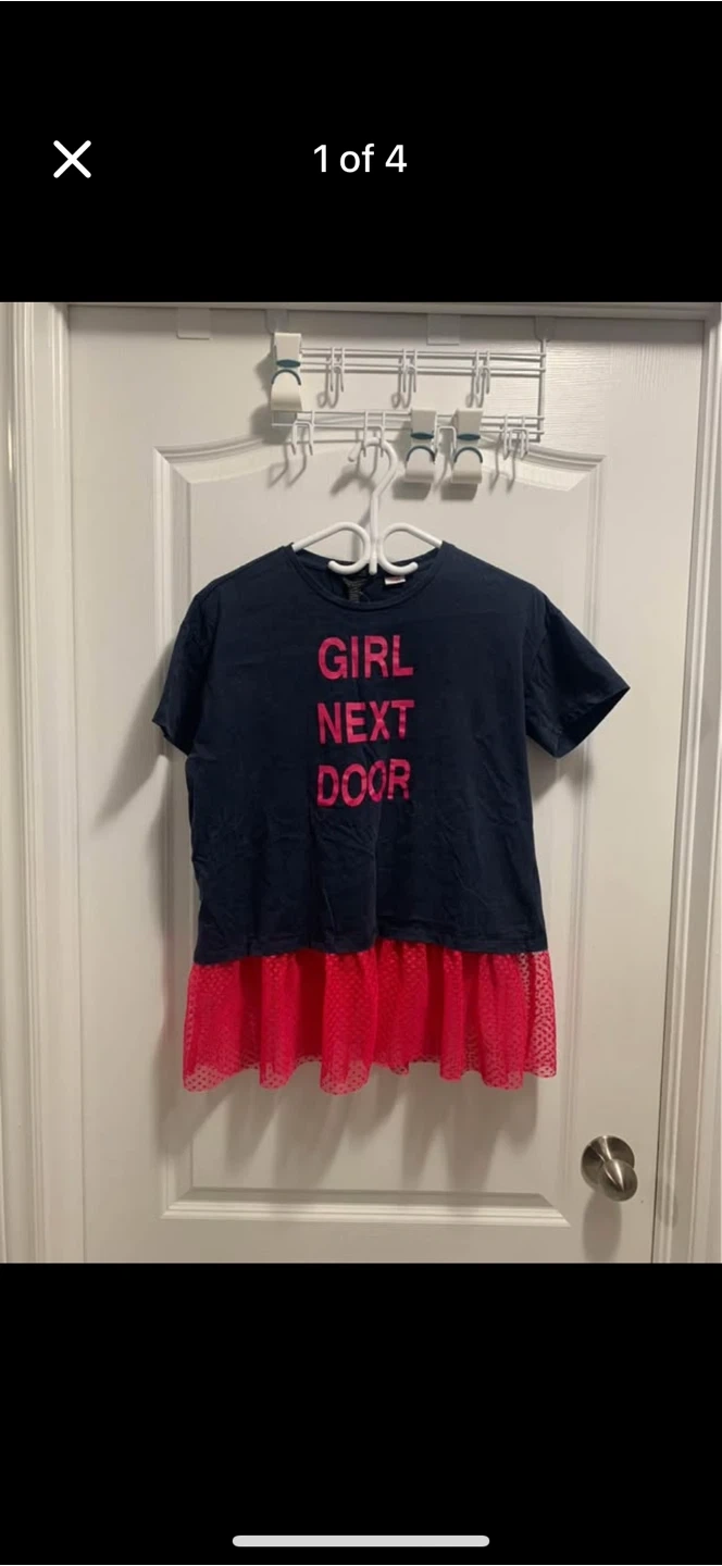 This cute Pure Collection t-shirt features the words "Girl Next Door" in a bright pink font. It's a size XL and has a fun, layered look with a pink mesh detail at the bottom. Originally bought for $12.99!