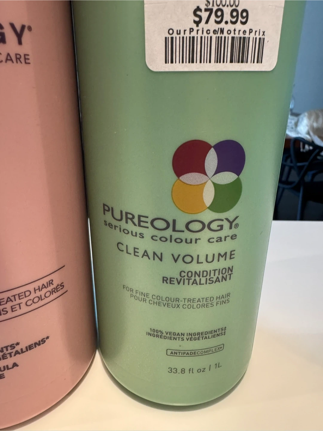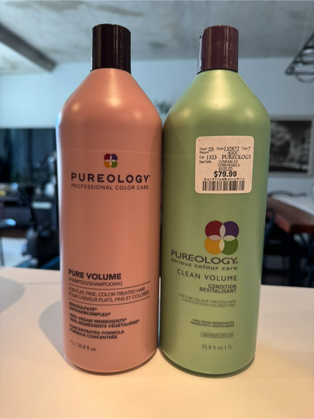 Selling a Pureology Pure Volume Shampoo and Clean Volume Conditioner set! Both are 1L/33.8 fl oz bottles. The Pure Volume shampoo is for flat, fine, colour-treated hair, while the Clean Volume conditioner is for fine, colour-treated hair as well. They both feature a concentrated formula with 100% vegan ingredients. Shampoo was used for two shampoos, but it’s just not for me. Conditioner was never used.
