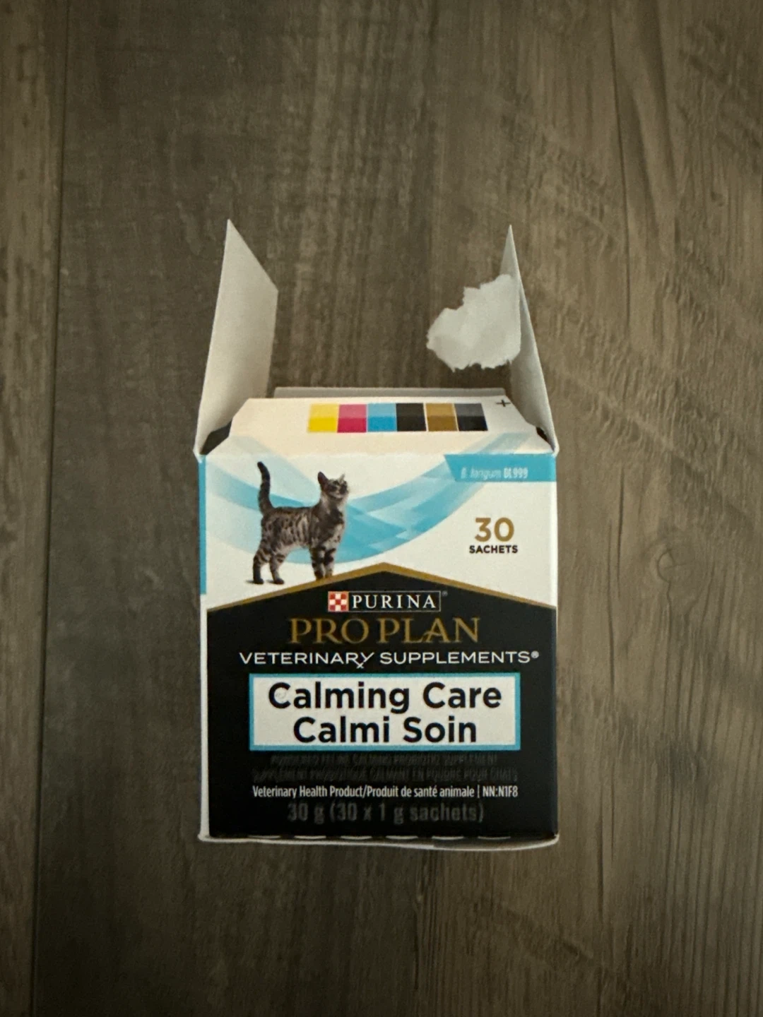 Selling a box of Purina Pro Plan Veterinary Supplements Calming Care for cats! There’s probably around 25 in here. It helps support calm behaviour in cats. The box is a little damaged, but the sachets are all sealed and in perfect condition!