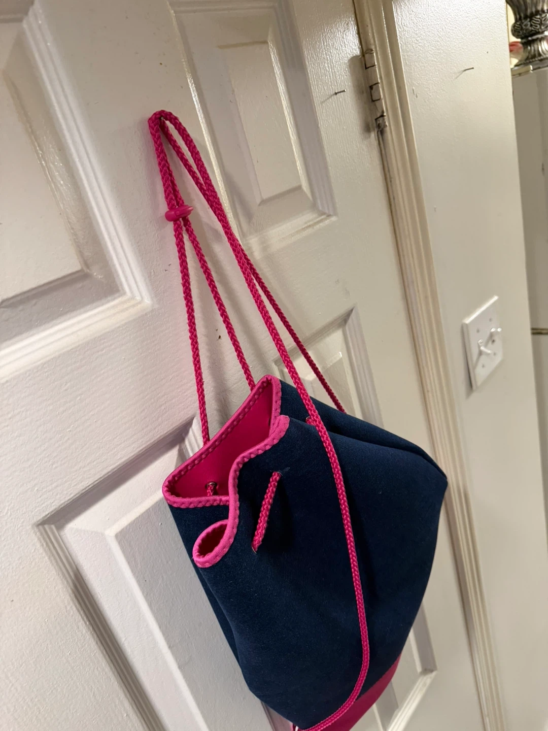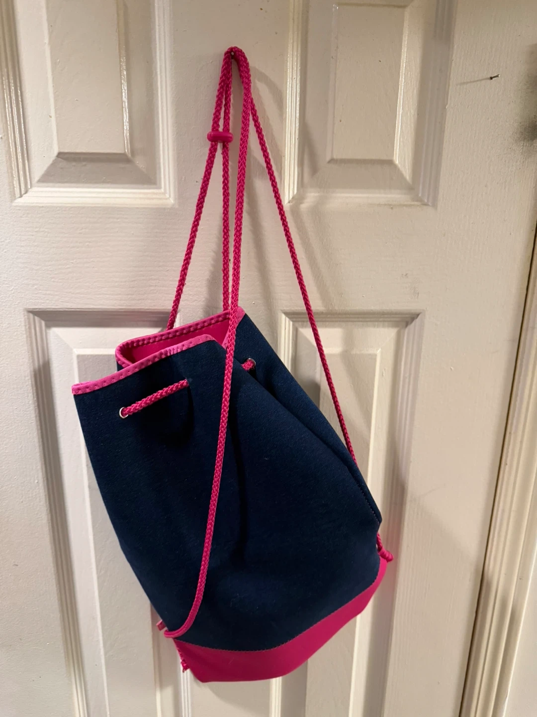 This is a navy blue drawstring backpack with bright pink accents. It has braided shoulder straps that double as a drawstring closure. The interior lining is also pink. It's a convenient size for everyday use!