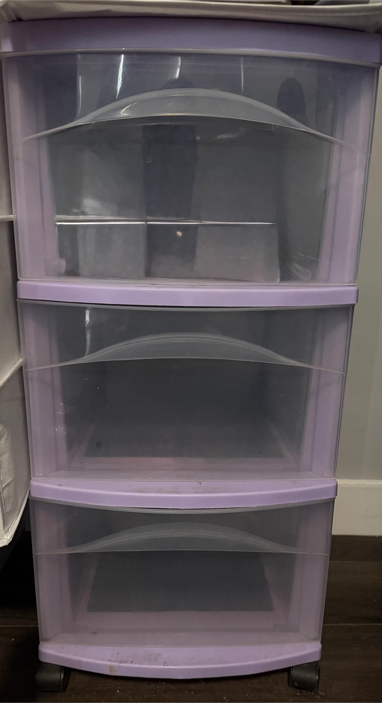 15Here's a handy purple rolling storage cart with three drawers! It's great for organizing your space and easy to move around thanks to the wheels Location : Main @ Danforth intersection, Toronto