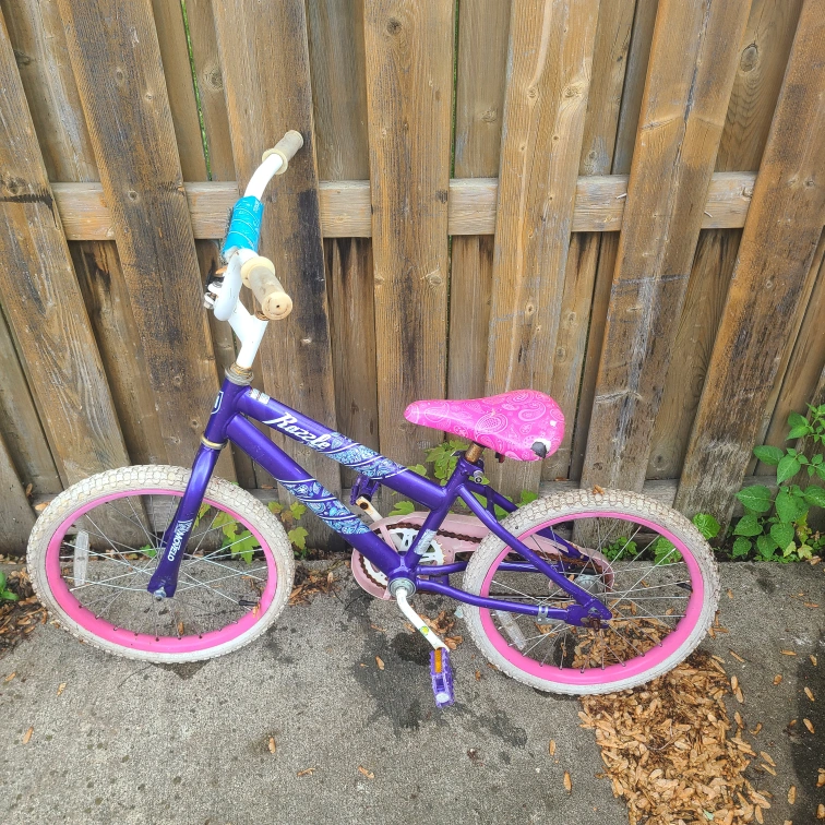 A bicycle with a purple frame. Features pink tires and a pink seat. The handlebars are white with blue wrapping. selling as is