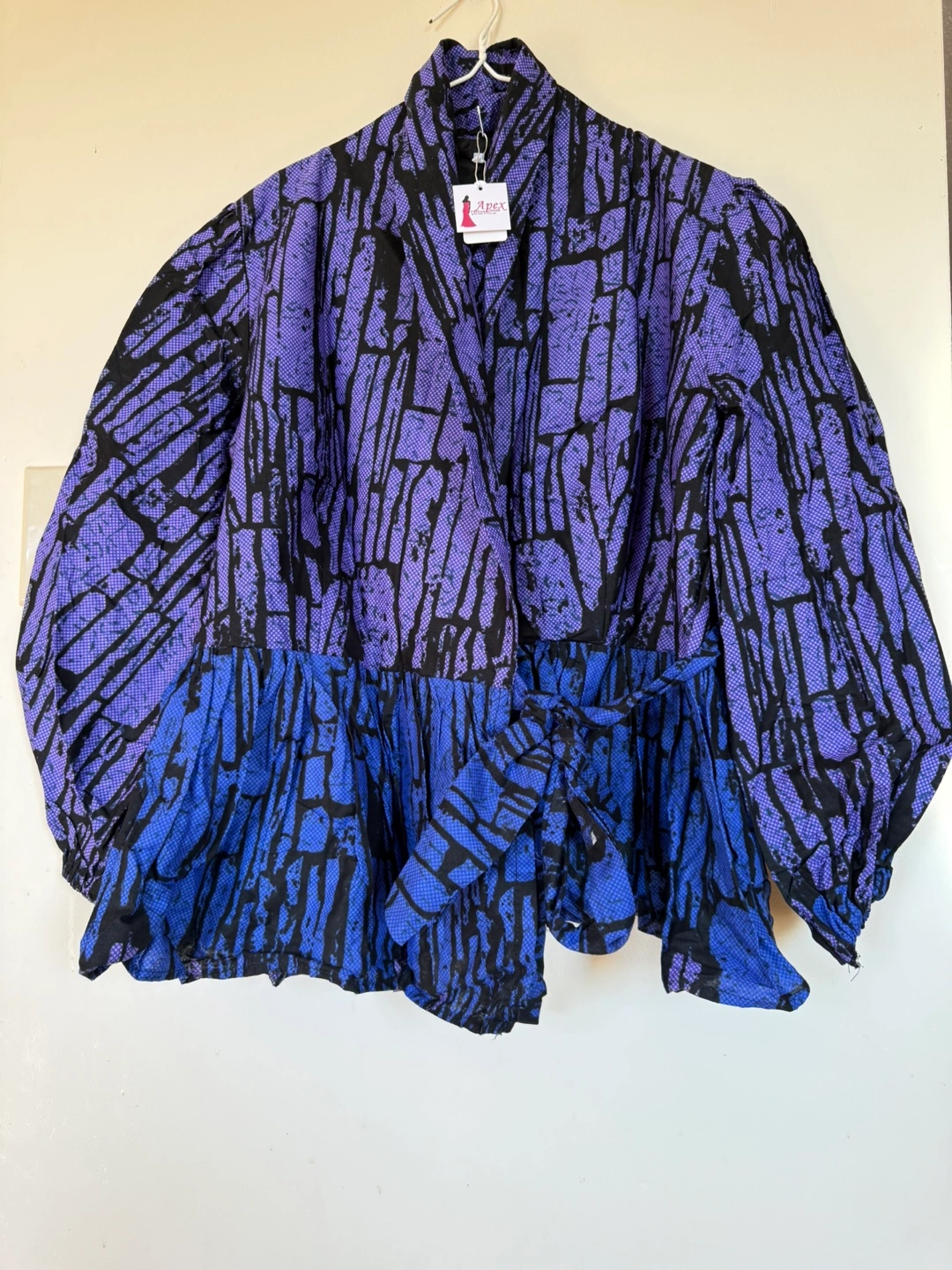 Long-sleeve wrap blouse. Features balloon sleeves and a tie waist. Unique abstract 100% Ankara print. Relaxed fit. Perfect for summer outings.