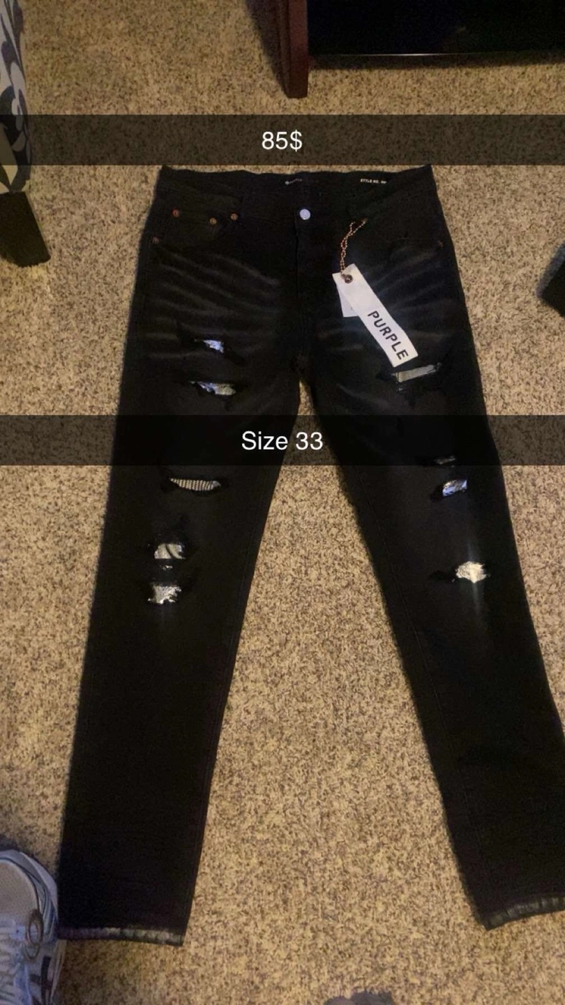 Selling a pair of Purple Brand jeans in black, size 33. They feature a stylish distressed design. Asking $85
