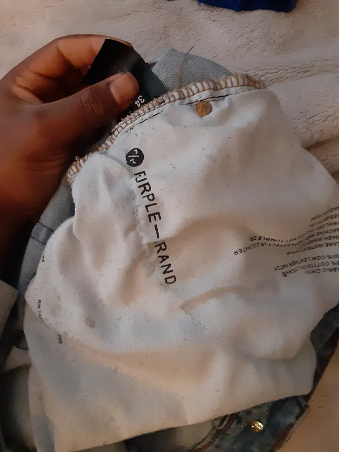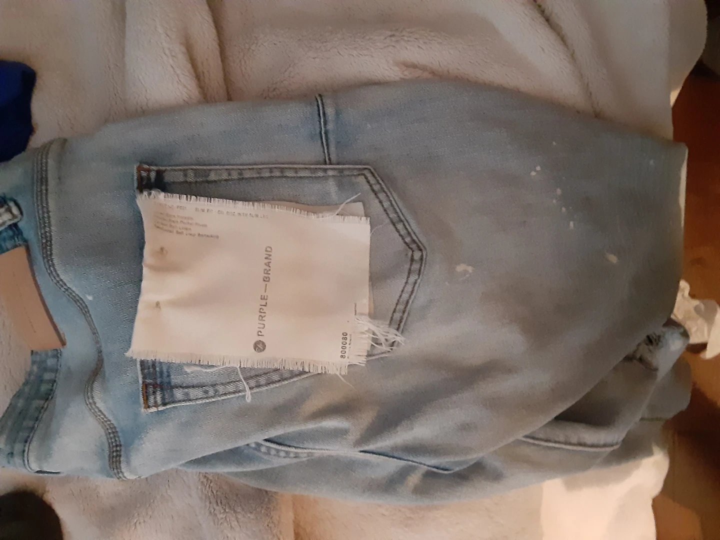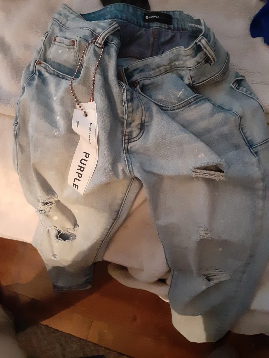 18Selling a pair of Purple Brand jeans in a light wash. These are a size 34 and feature a cool distressed look with some rips and paint splatter details. They're made from a comfortable denim material and have a classic five-pocket design. Great for adding some edge to your wardrobe!