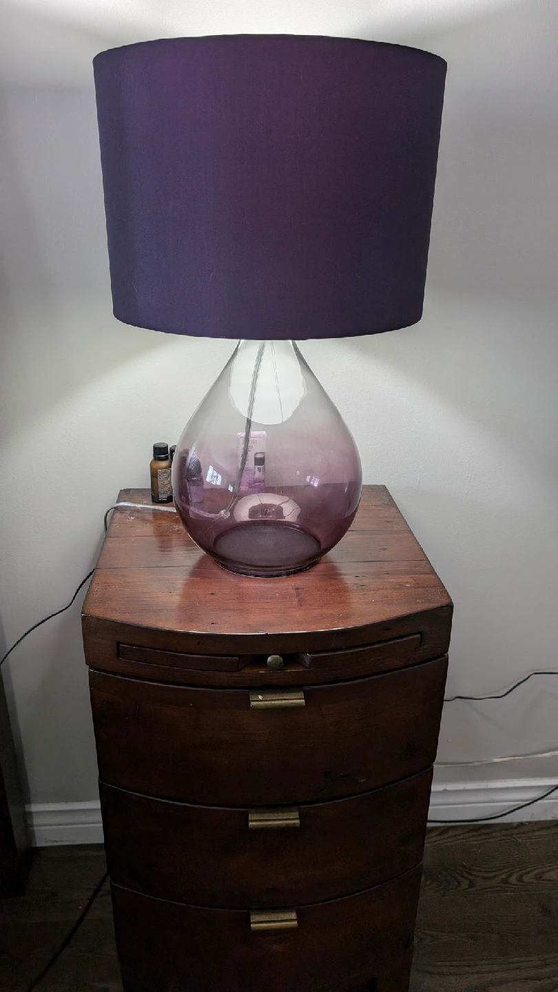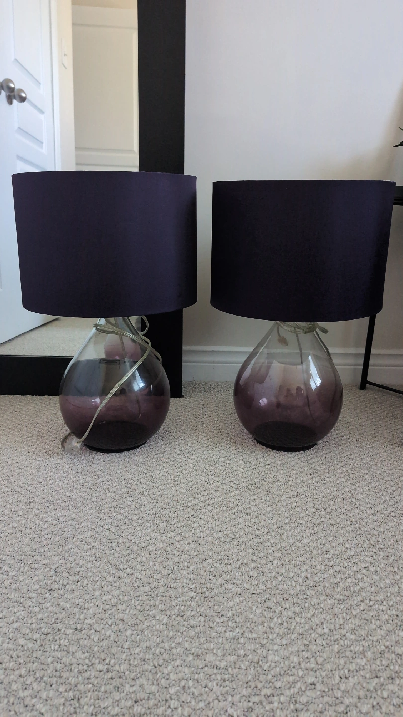 65Selling 2 stylish purple glass table lamps. They would be a great addition to any room! Please note that there is some wear and tear on one of the lampshade as shown in the pictures