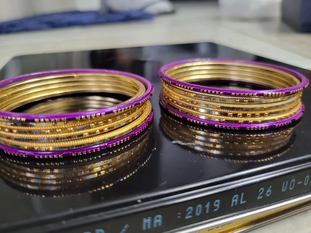 Selling a set of beautiful bangles in purple and gold tones! These would be perfect for adding a touch of elegance to any outfit. They're in great condition and ready for a new home