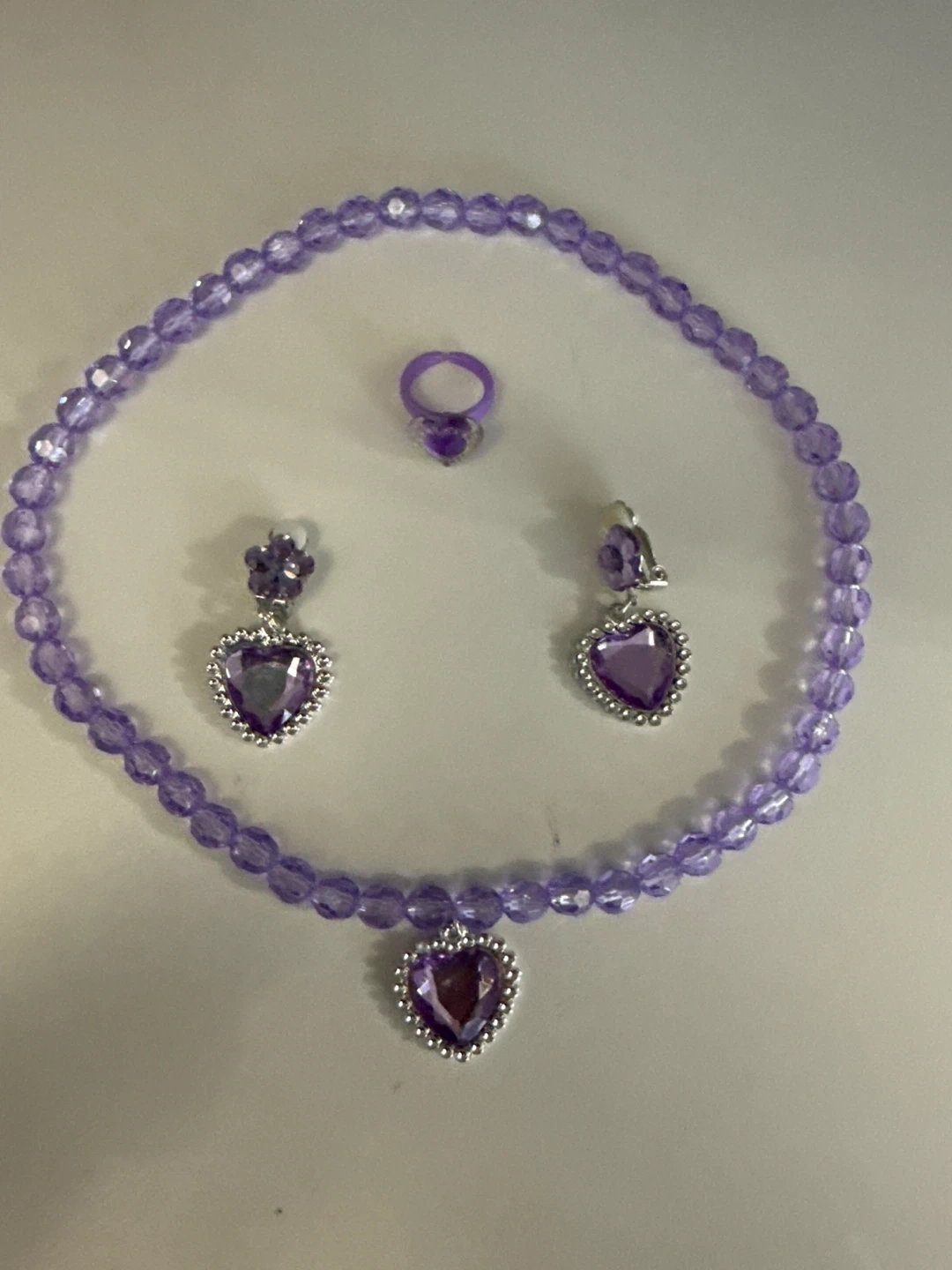 78A cute matching set of purple heart jewelry! Includes a beaded necklace, clip-on earrings, and a ring, perfect for dress-up or a little sparkle, kids jewelry