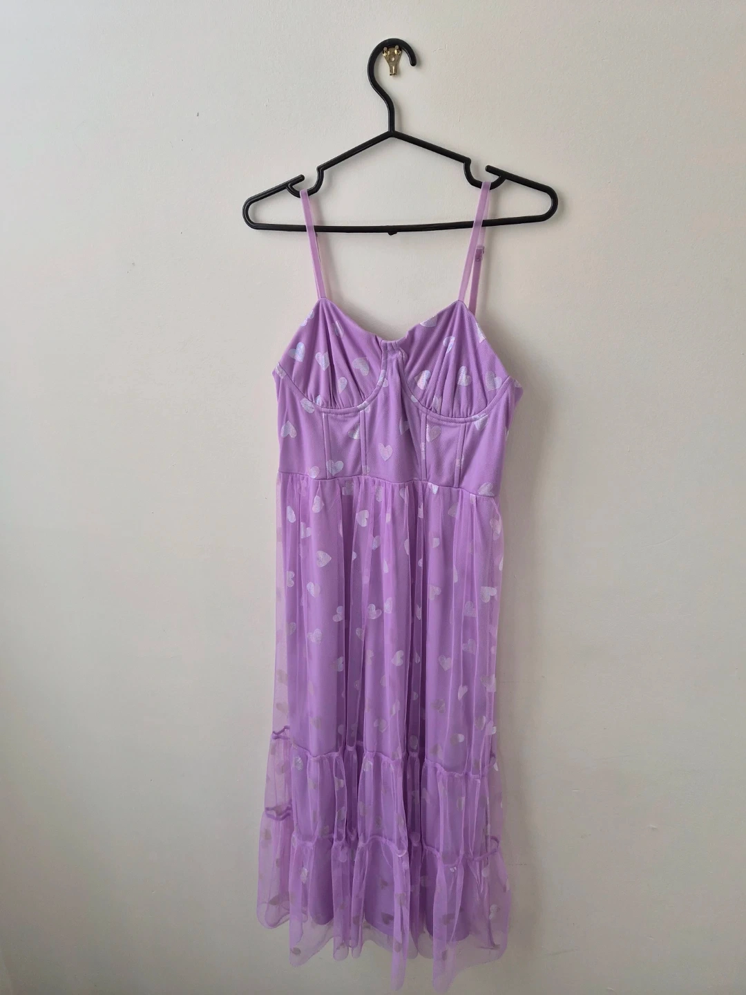 60Selling a cute purple dress with a heart pattern! It has adjustable straps and a tiered skirt. Perfect for a party or a night out.