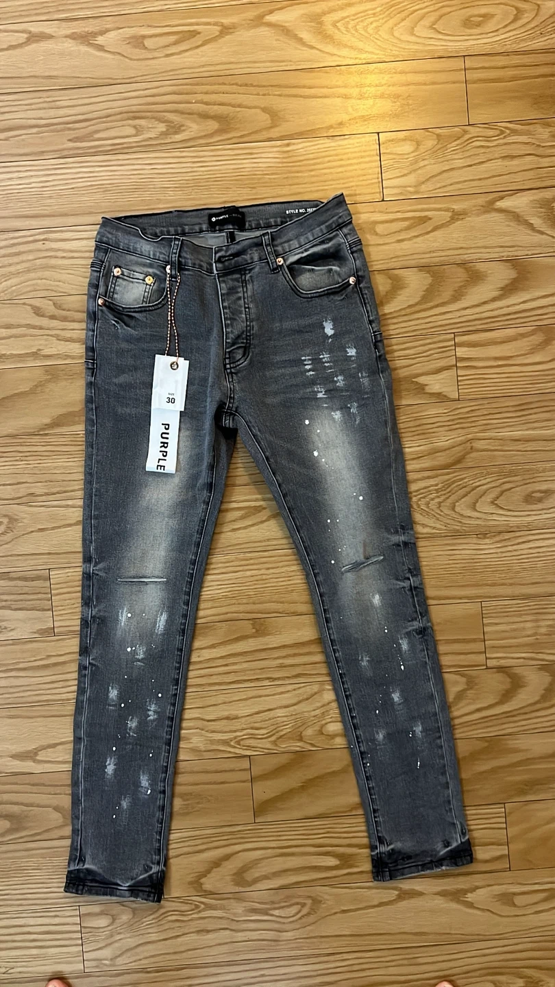 Selling a pair of Purple Brand distressed denim jeans in size 30. They feature a stylish, worn look with paint splatter details throughout. Perfect for adding an edgy touch to your wardrobe! Rep