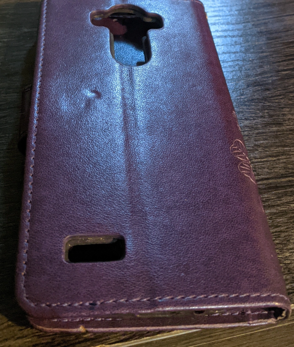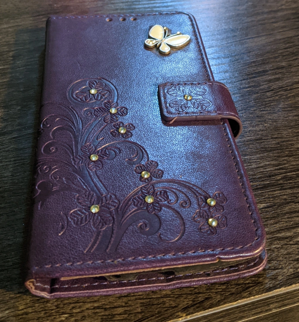 Selling a purple leather phone case. It has a magnetic closure and a butterfly embellishment. The case also has slots for cards on the inside cover. It appears to be in good condition!