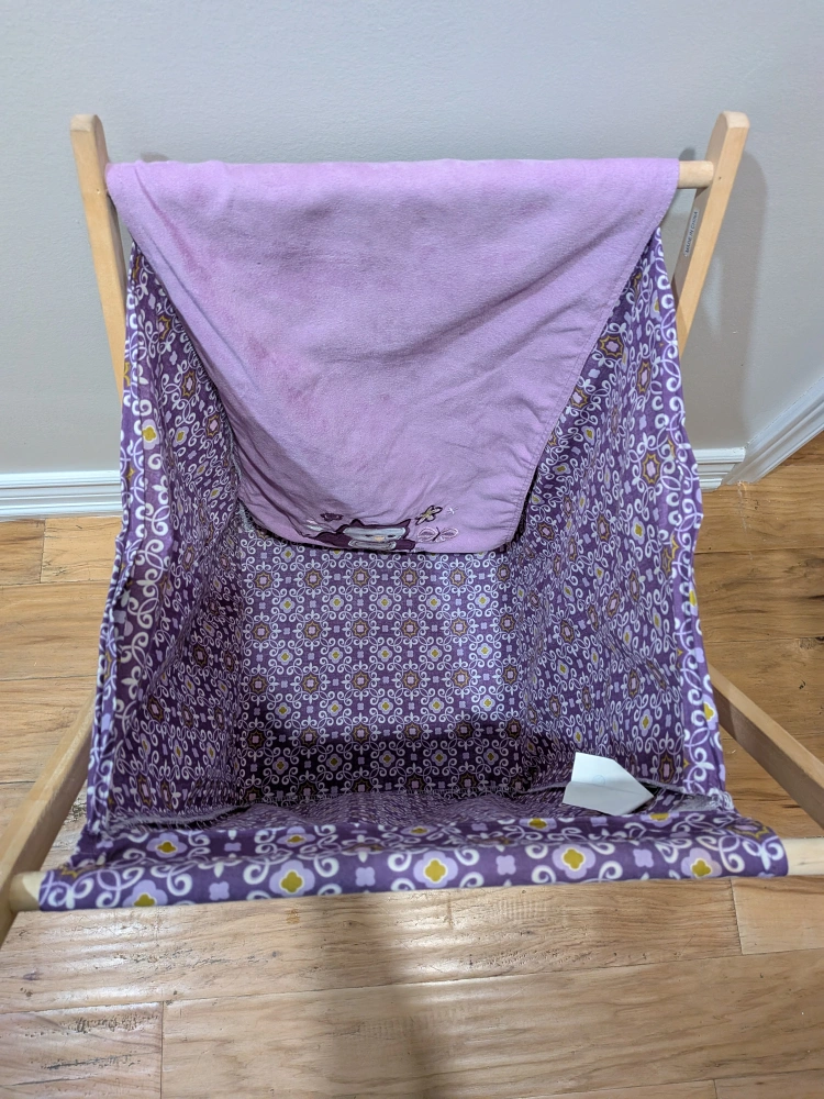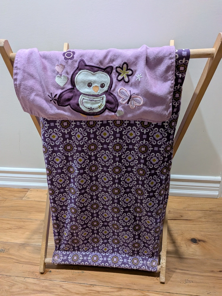 This is an adorable purple hamper featuring an owl design. It's perfect for a kid's room or nursery. It's in good condition and ready for a new home! 27" x 16" x 16"