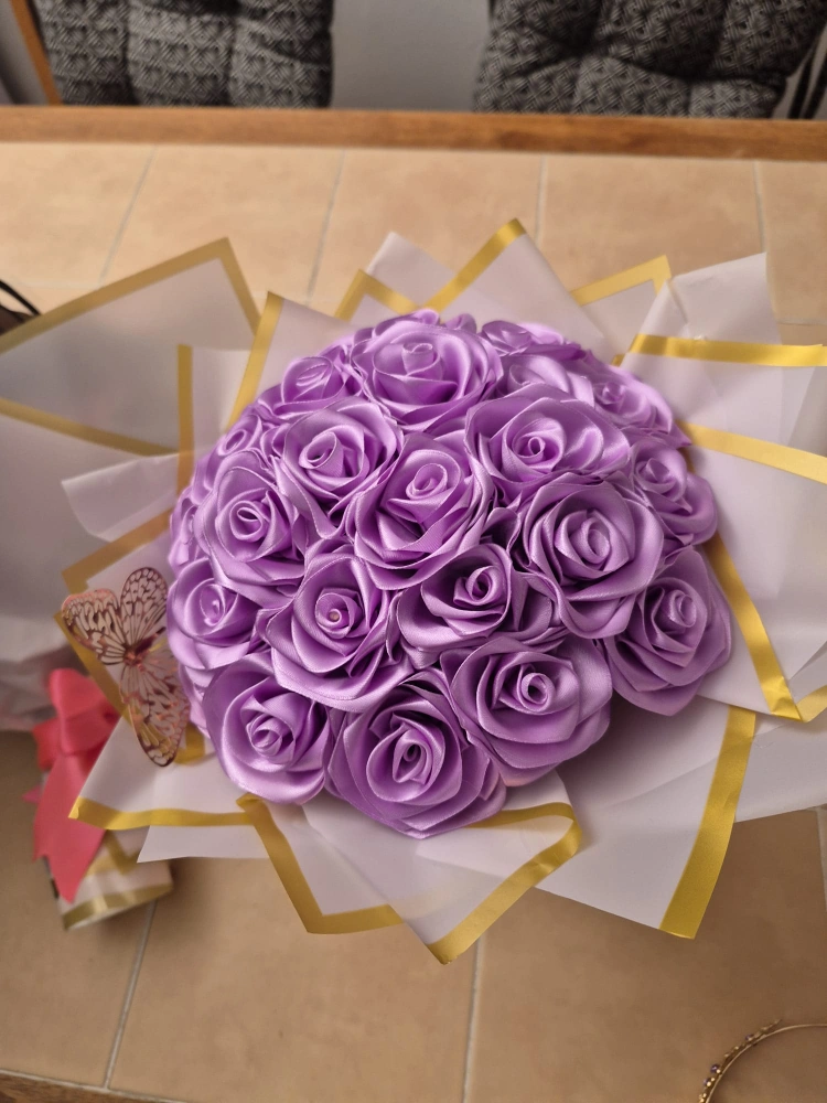 10Beautiful bouquet of purple roses, perfect for a gift or decoration! The roses are made of a soft, satin-like material and are arranged in a lovely, round shape. It's wrapped in white paper with gold trim and a butterfly accent