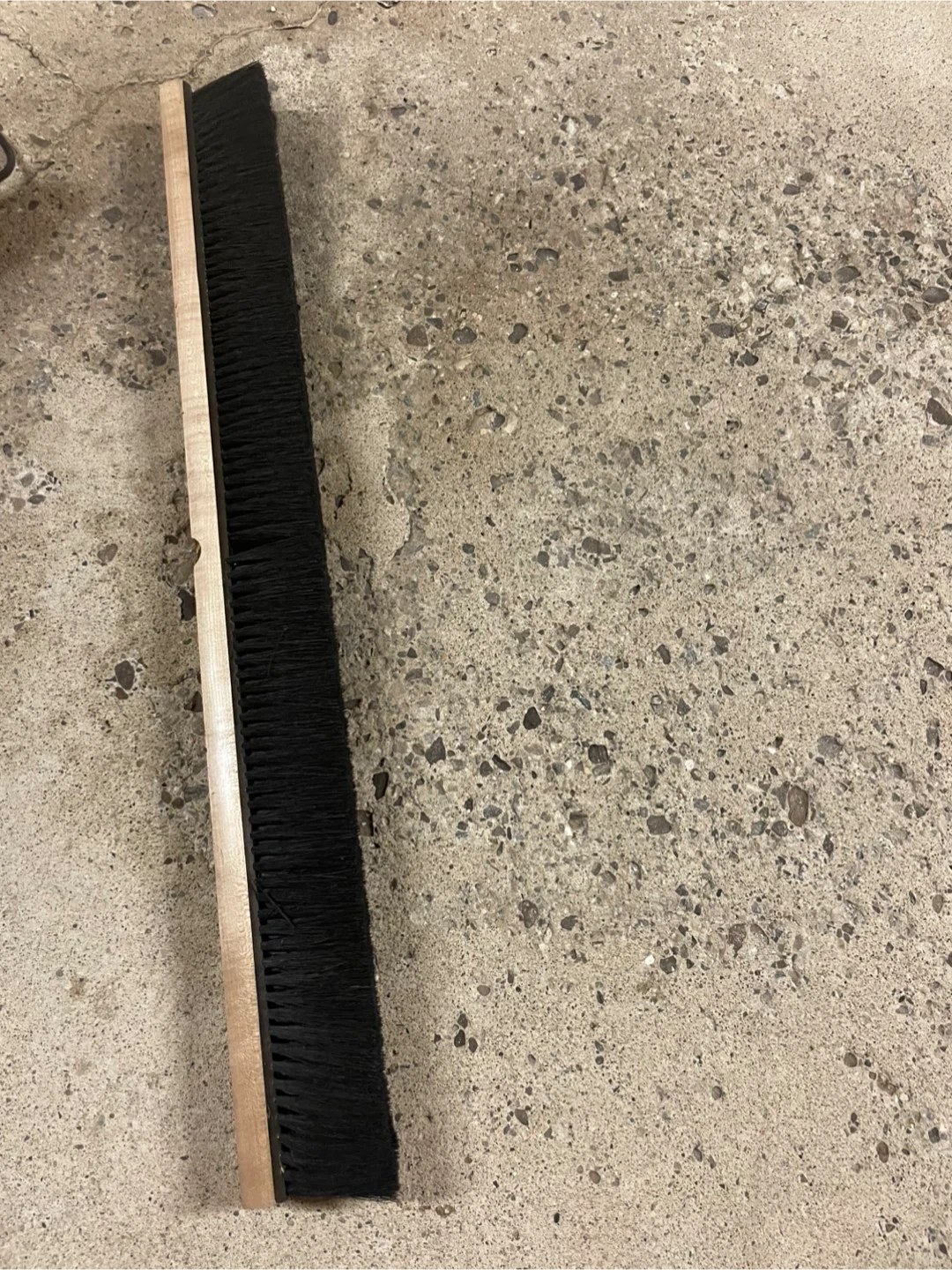 Selling a push broom with black bristles and a wooden handle. It's in good condition and ready to help you keep your space clean. Perfect for sweeping up leaves, snow, or any other debris on your driveway or patio