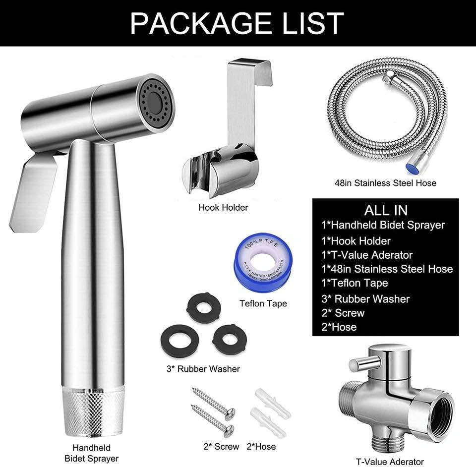 - Handheld Bidet Sprayer, Hand Bidet Toilet Spray, Muslim Shower Jet Spray - Brand New Bidets. - Stainless steel material bidet. - Adjustable water pressure Shattaf. - Multiple pickup locations in GTA. - Complete full set included in package (please check images in the ad): Stainless Steel Bidet Sprayer. 4 feet Toilet Hose. Brass T-Valve Adapter. Stainless Steel Bidet Holder. Wall Mount/Hook Holder. Teflon Tape, Accessories Set.