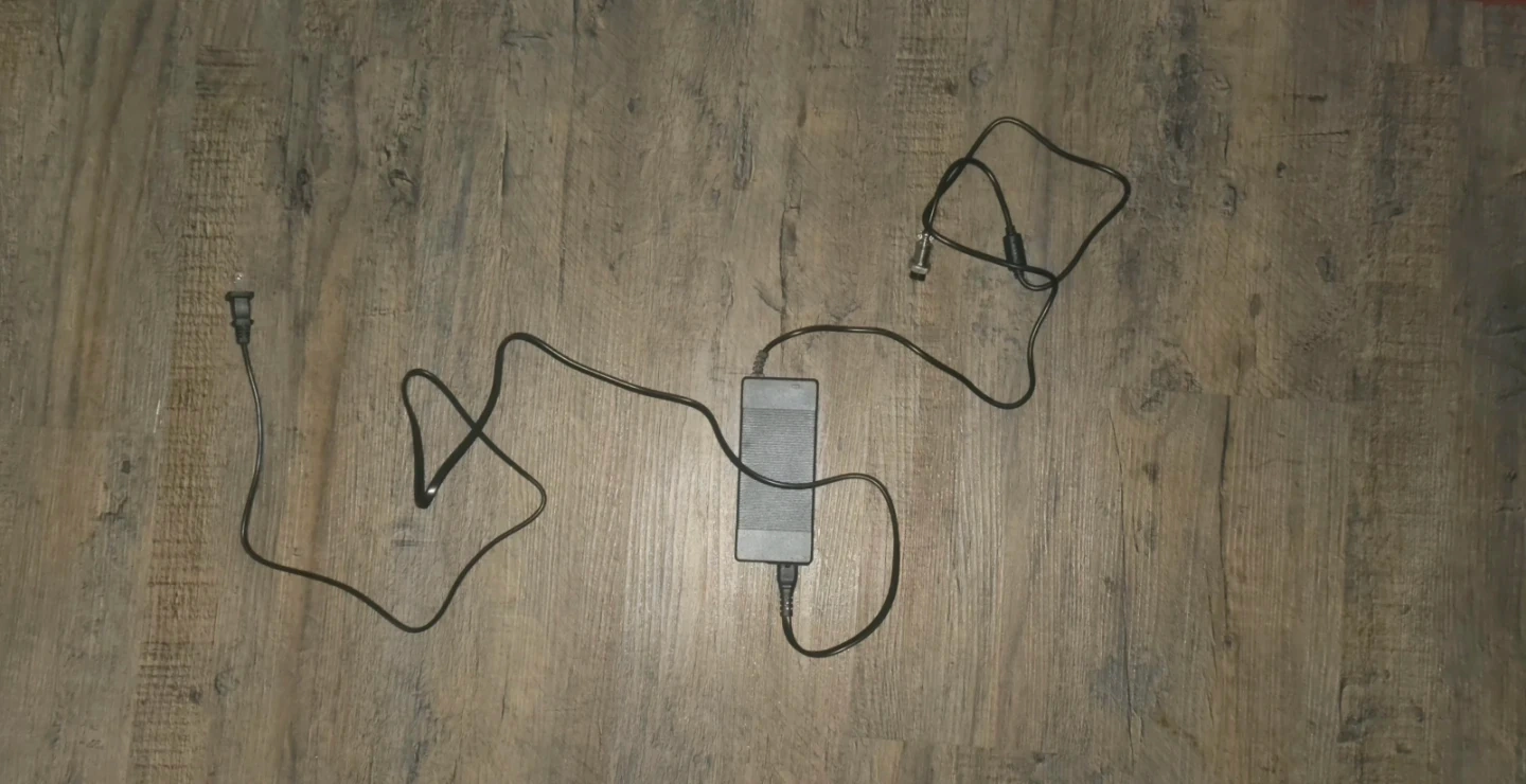 Plug City E-Scooter charger. Around 8 feet long. Plugs into any wall outlet and screws onto the charging port on the E-Scooter to secure charging.