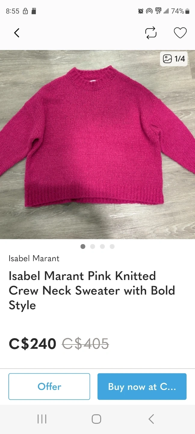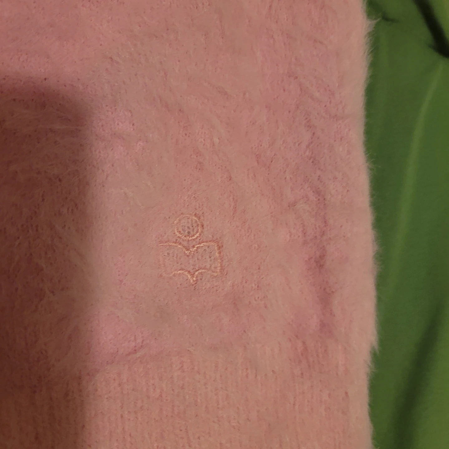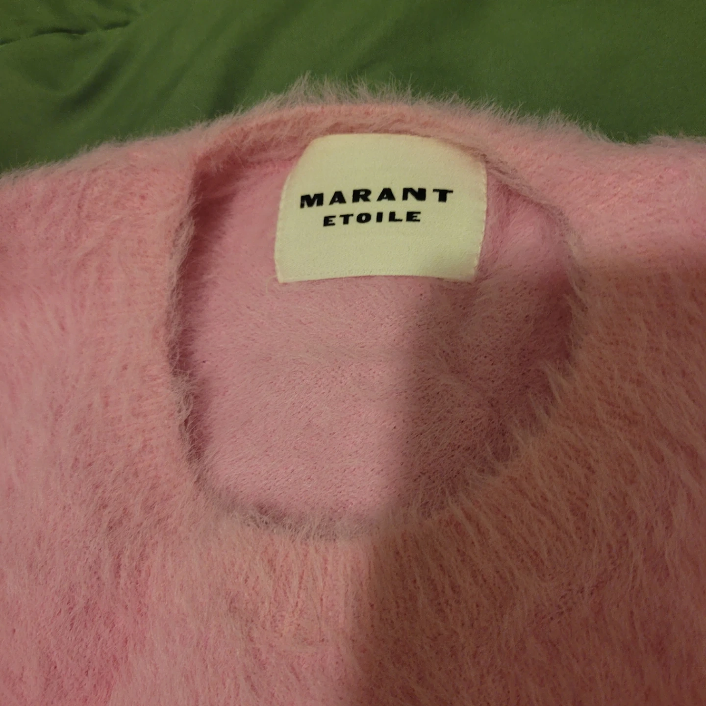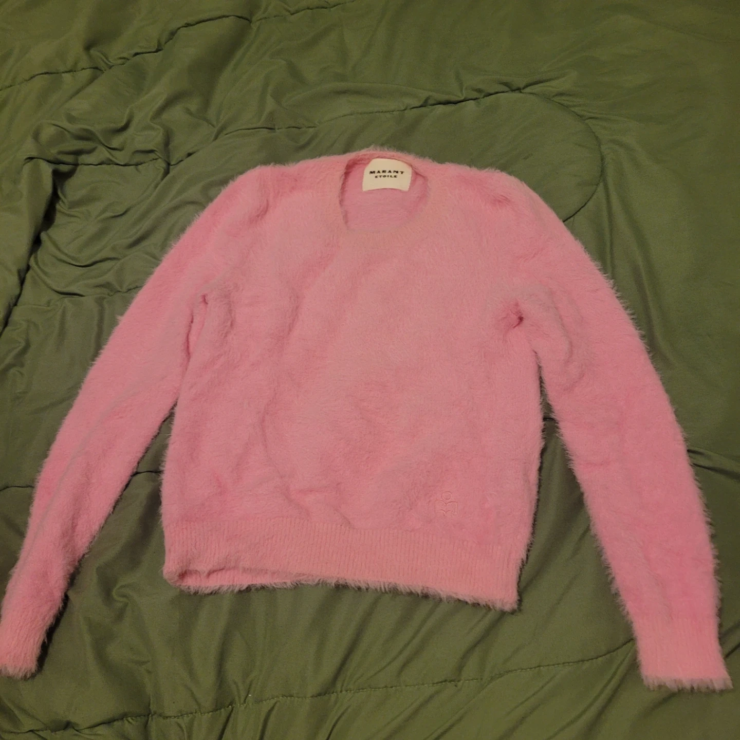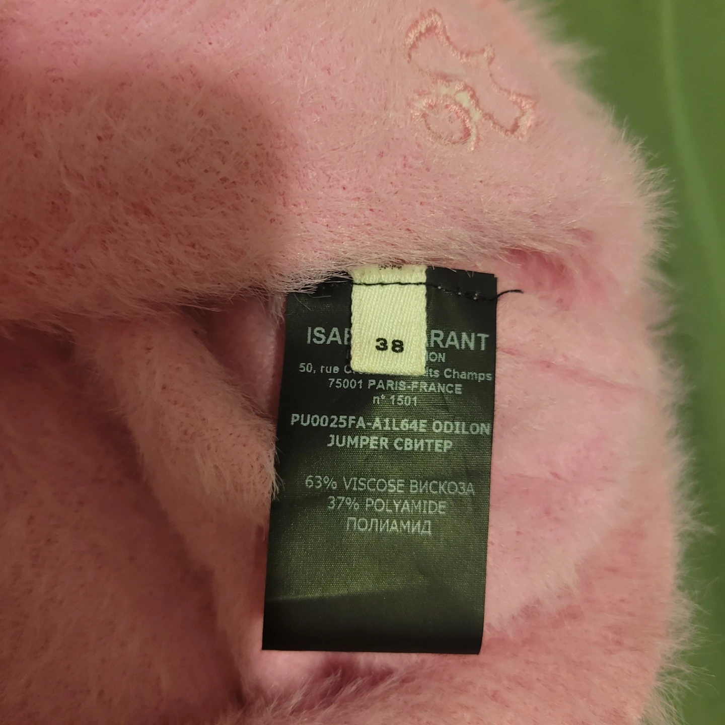 Marant Étoile fuzzy pink sweater. It's a size 38. Made with 63% viscose and 37% polyamide.