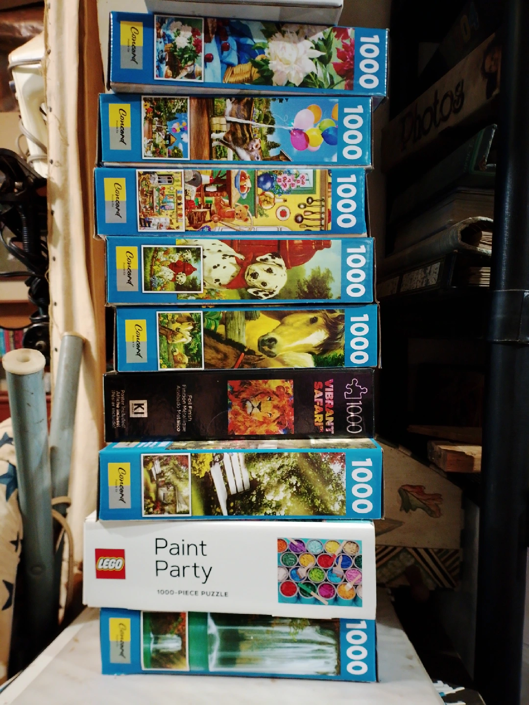 15Good sturdy construction table, perfect for puzzles! Including 9 x 1000 piece puzzles, each done only once or twice. 1 extra piece in the drawer, not sure if it belongs or not 🤷.