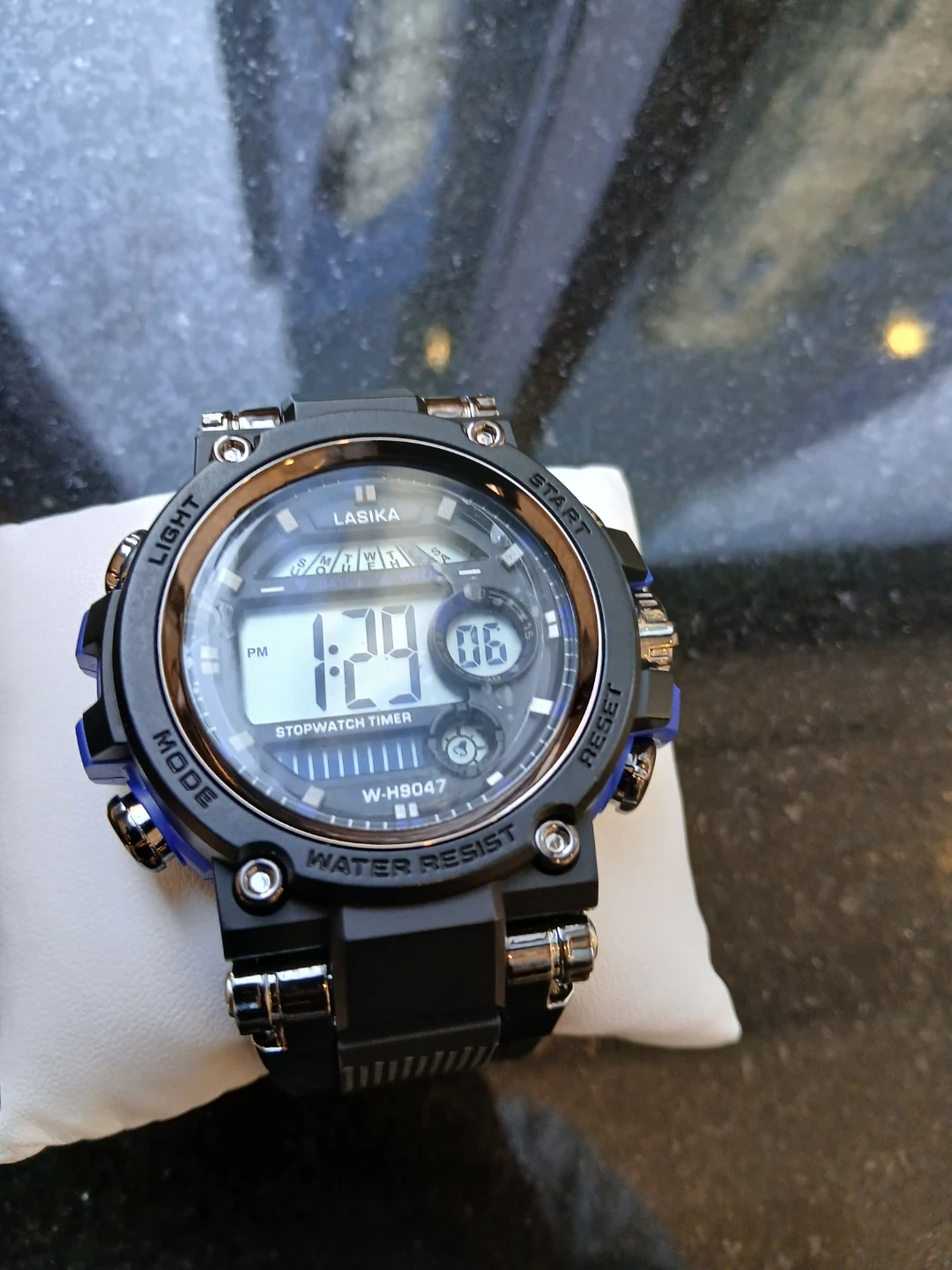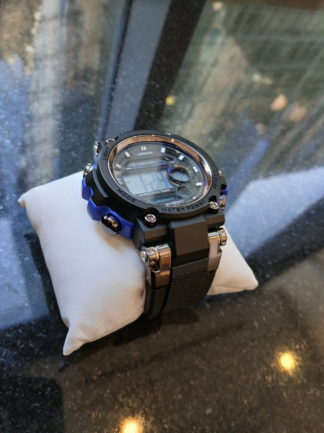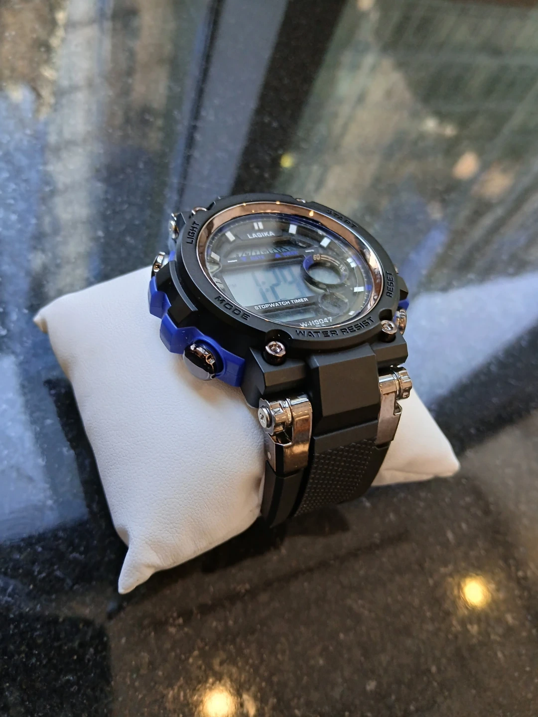 Lasika digital sport watch with stopwatch timer. Water resistant and features a black band with blue accents. Model W-H9047.