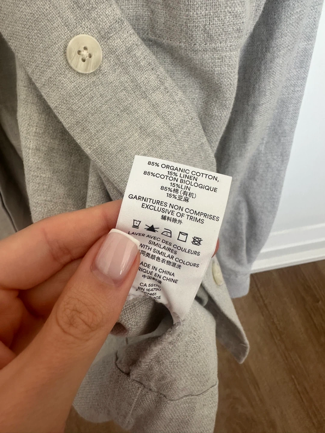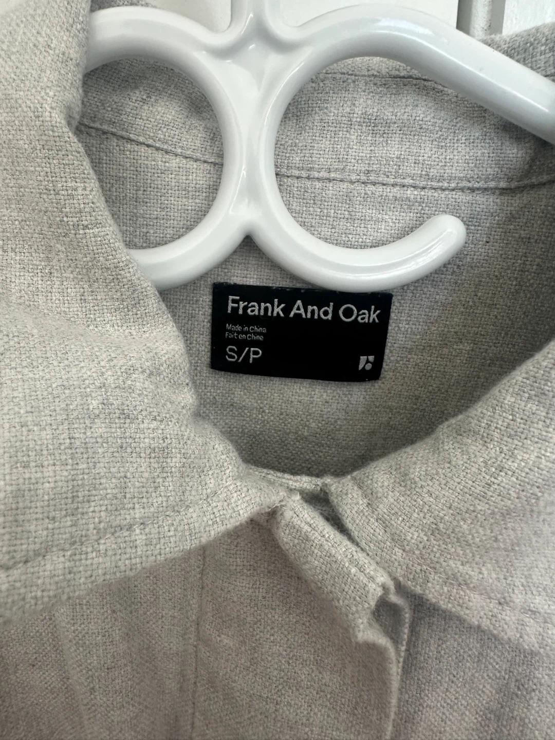Frank And Oak shirt in a light grey colour. Made from 85% organic cotton and 15% linen. It features a button-up front and two chest pockets. Size S/P.