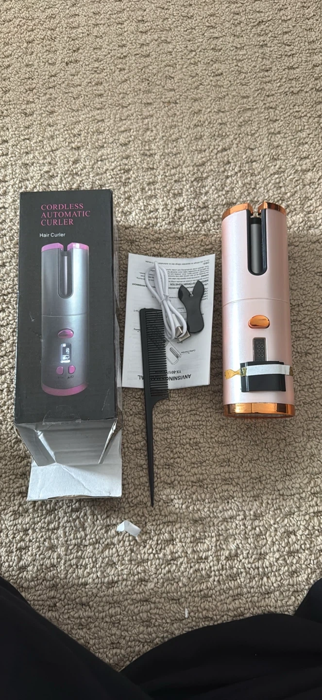 This is a cordless automatic hair curler. It includes the device, a USB charging cable, a comb, and a clip. The unit has an LCD display showing temperature and rotation settings.