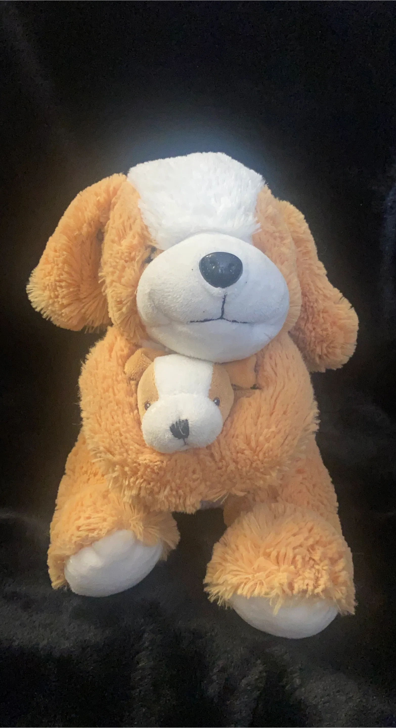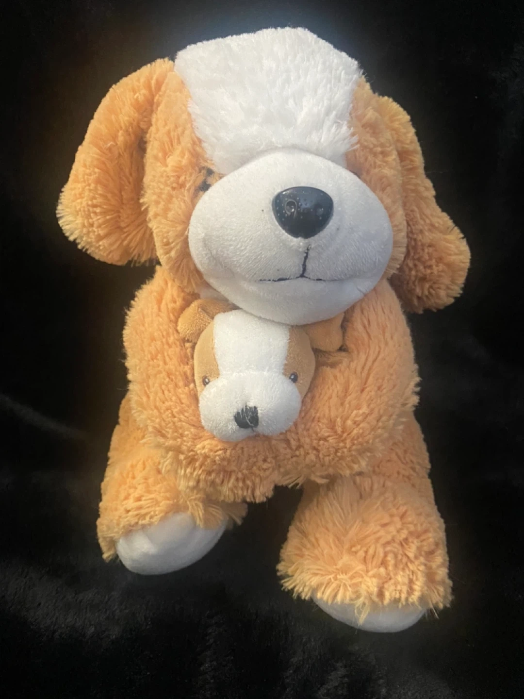 This is a cute and cuddly Creature Comforts plush dog, perfect for kids or collectors. It is in used, but like nee condition, and features a soft, huggable design with a smaller dog attached to its chest.