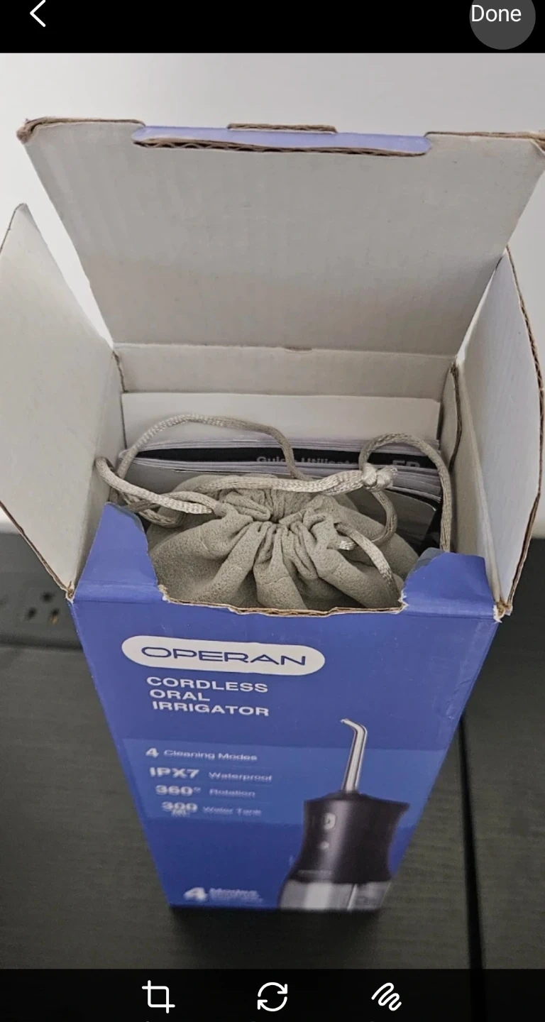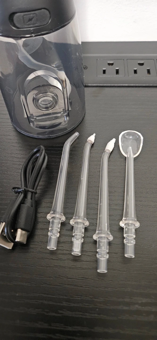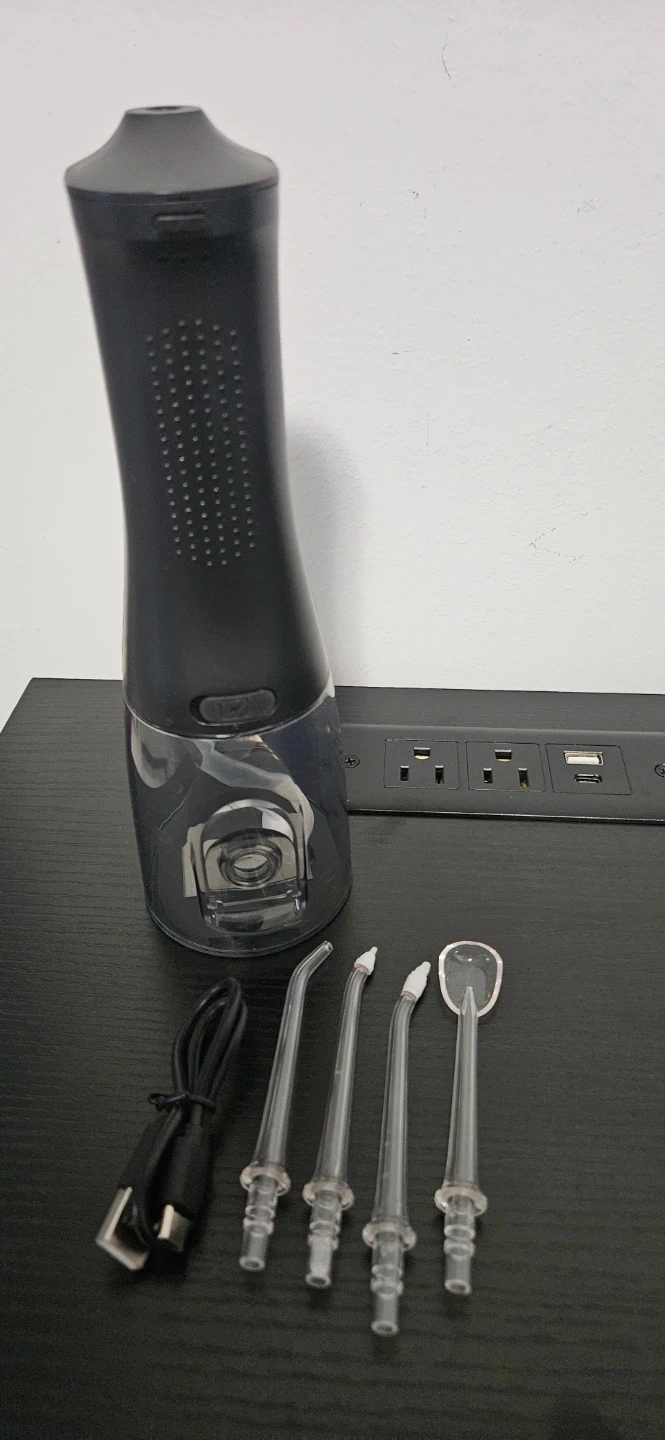 This OPERAN cordless oral irrigator comes with a USB charging cable and four different cleaning tips. It's IPX7 waterproof with 4 cleaning modes and a 360-degree rotation. The water tank has a generous capacity. It's handy for maintaining oral hygiene on the go!