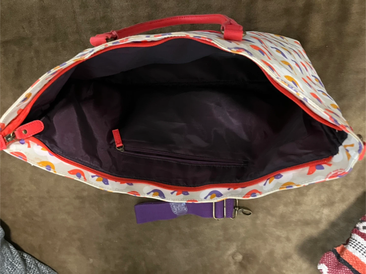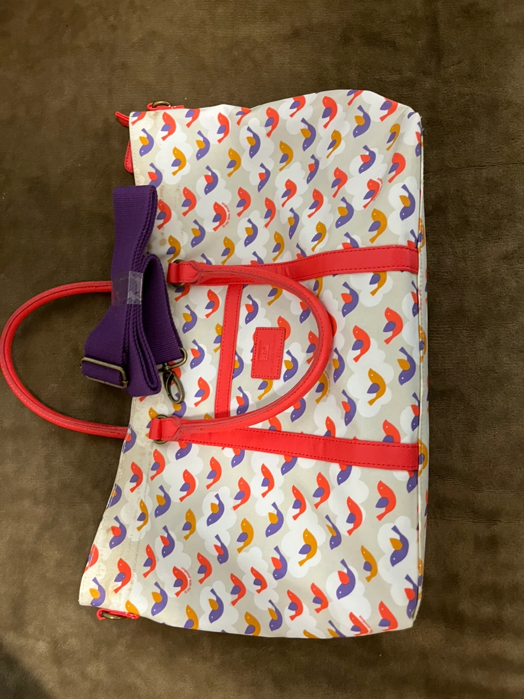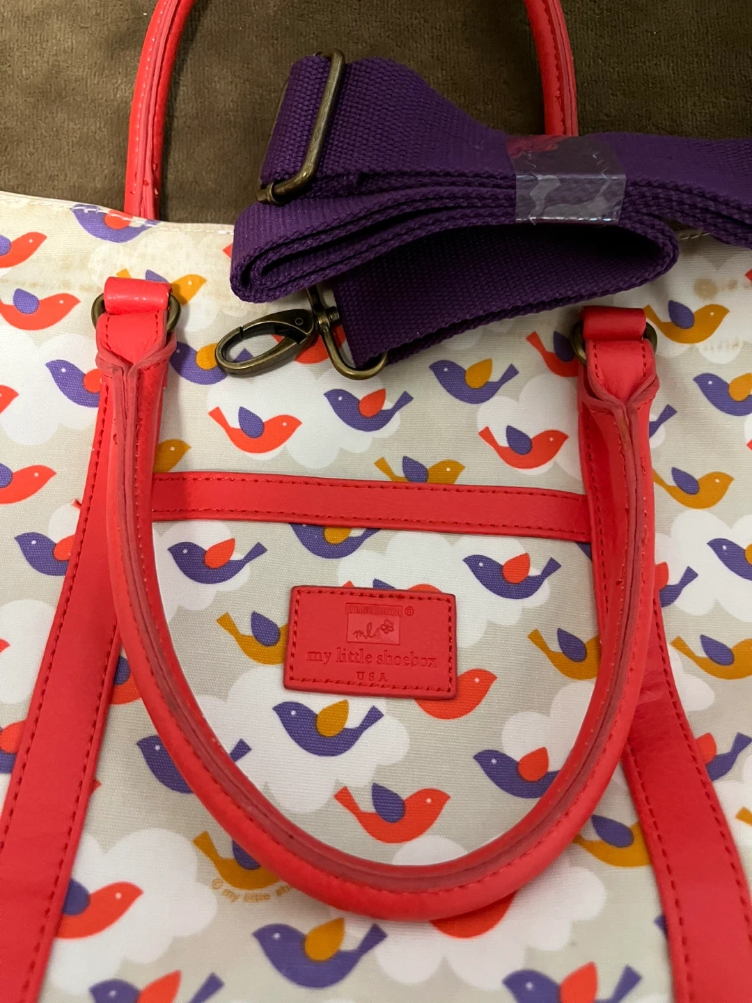 This My Little Shoebox bag has a fun bird and cloud print. It features red faux leather accents and handles, plus an adjustable purple shoulder strap. It's perfect for a weekend getaway or as a carry-on bag!
