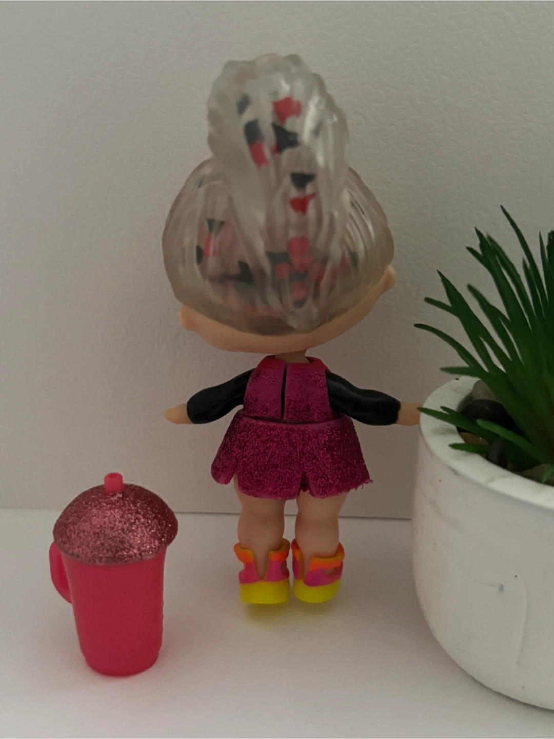 This is a LOL Surprise doll with a sparkly pink dress and black sleeves. It comes with a matching pink accessory cup. The doll has clear hair with pink and black highlights, and wears colourful shoes.