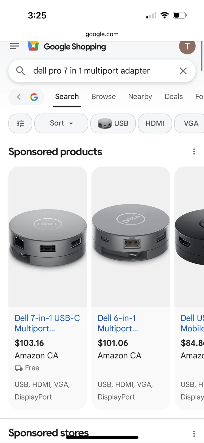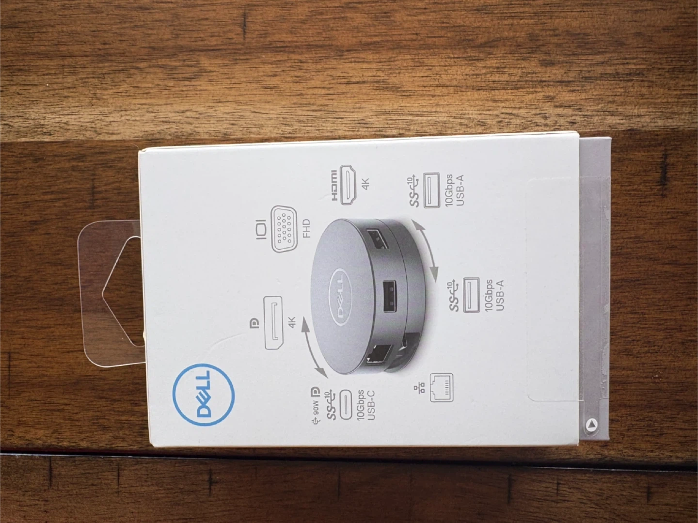 This Dell Pro 7-in-1 USB-C Multiport Adapter connects to your laptop via USB-C. It features HDMI, VGA, DisplayPort, and 10Gbps USB-A ports. Also includes one 10Gbps USB-C port supporting 90W PD passthrough.