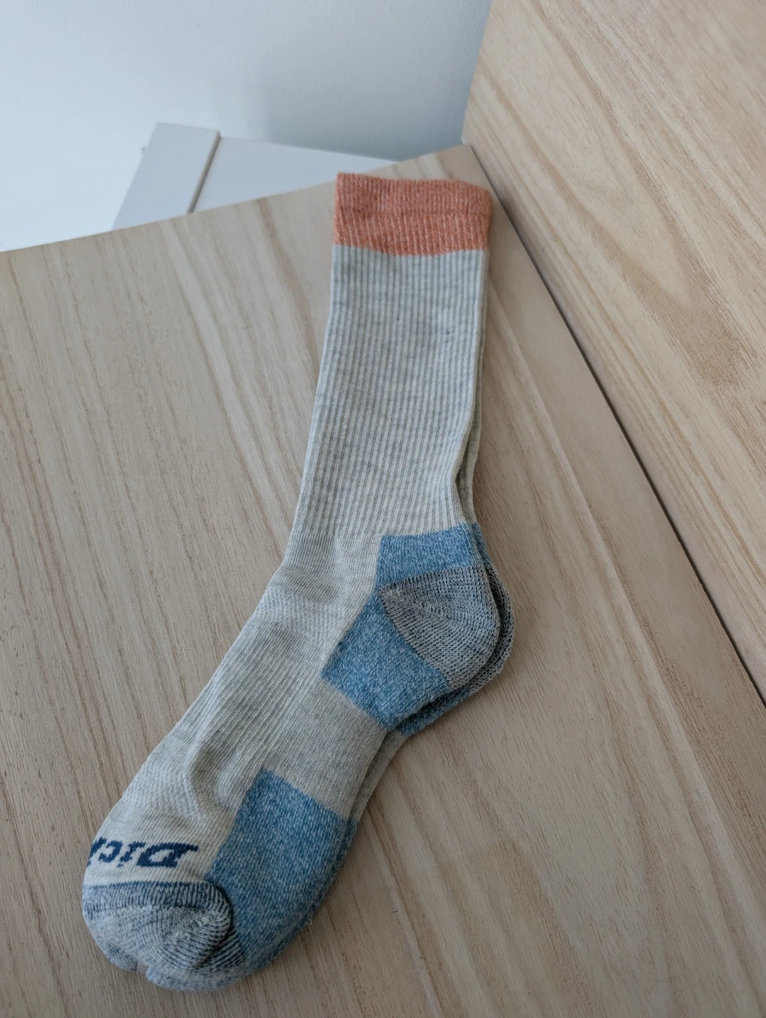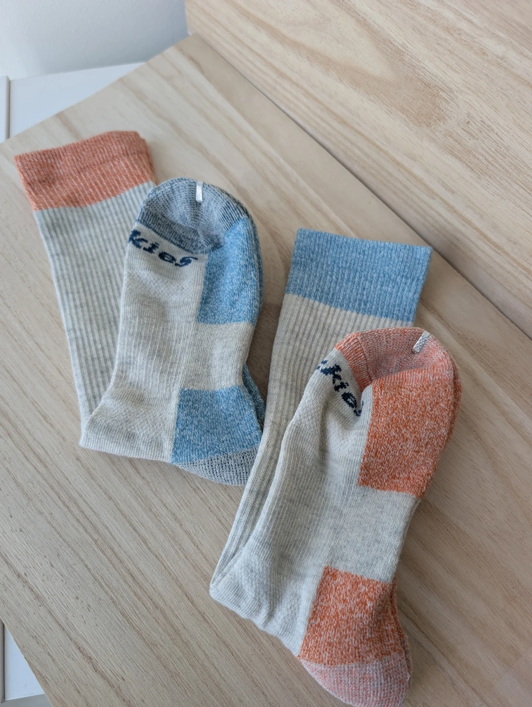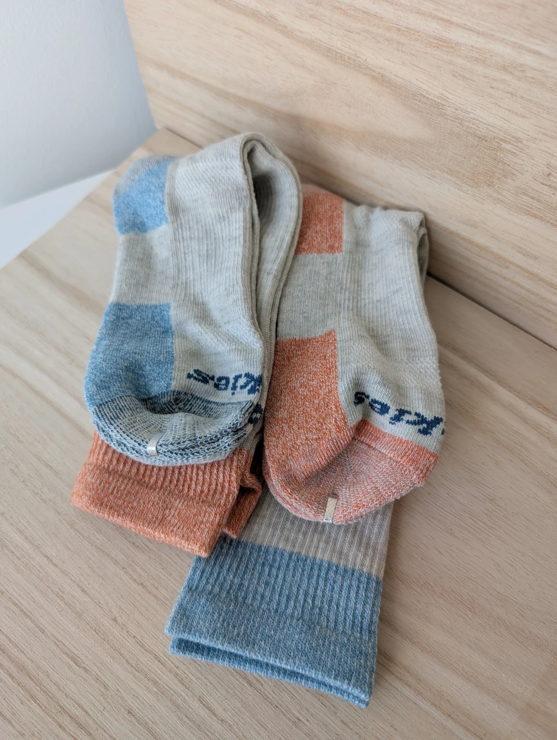 Two pairs of socks. Grey with blue and orange accents. Ribbed cuff and textured toe/heel.