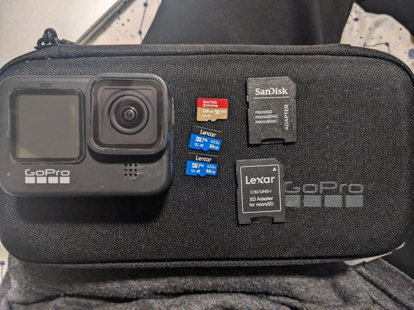 GoPro HERO9 Black action camera. Includes the camera, a carrying case, 4 batteries, flexible silicone protector, 1x SanDisk 128gb and 2x Lexar 36gb micro sd cards and readers. SanDisk micro sd card can be sold separately for $50, everything else sells for $350. Lots of accessories available, DM if interested.