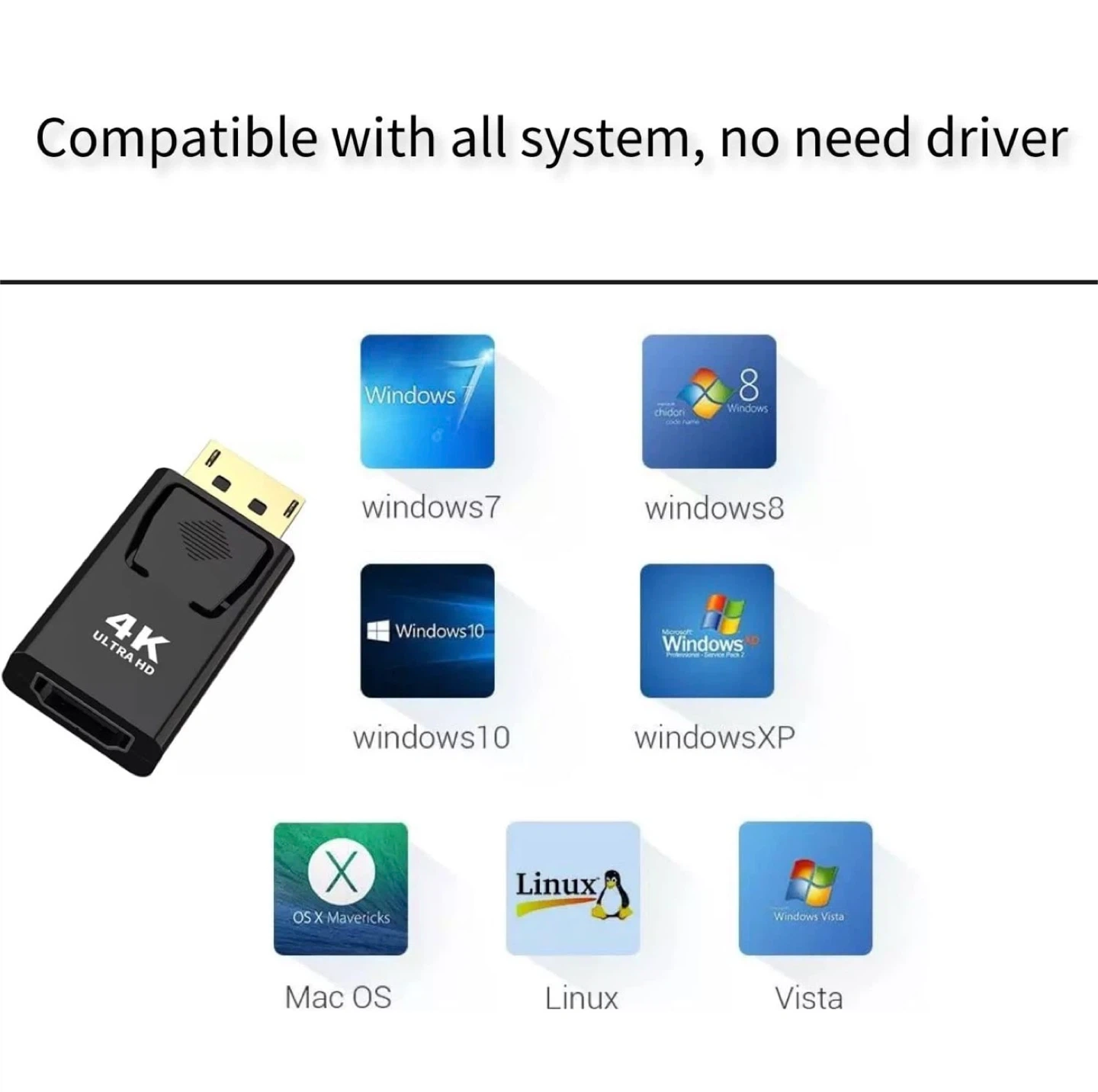 This adapter supports 4K Ultra HD resolution and is compatible with Windows, Mac OS, and Linux systems. It's plug-and-play, requiring no drivers for setup. It provides a convenient way to connect devices with a DisplayPort output to a display with an HDMI input.