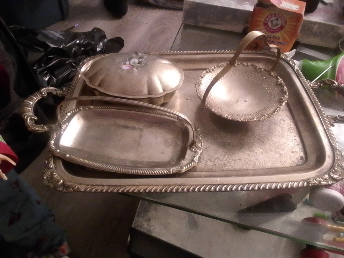This set includes a large serving tray, a covered dish, and a small decorative bowl with a handle. It's silver plated and features ornate detailing on the edges. The covered dish has a floral design on top.