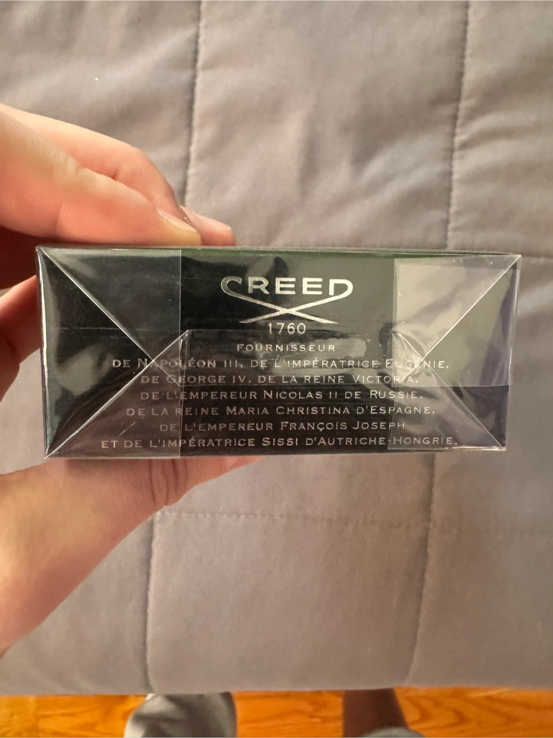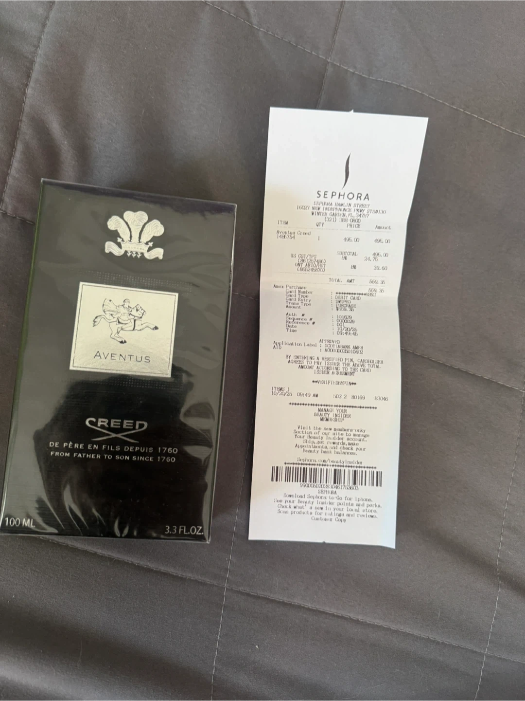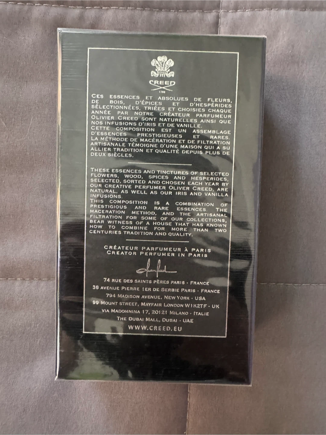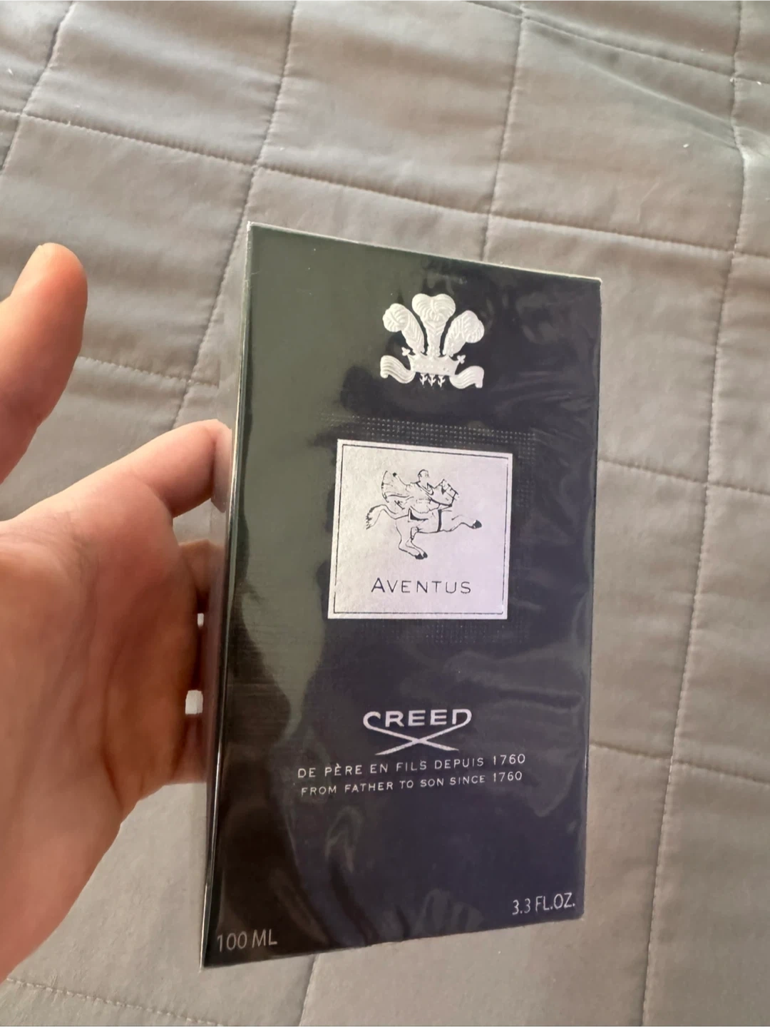 This is a 100ml bottle of Creed Aventus Eau de Parfum. It's a fragrance production from France. The bottle is sealed.