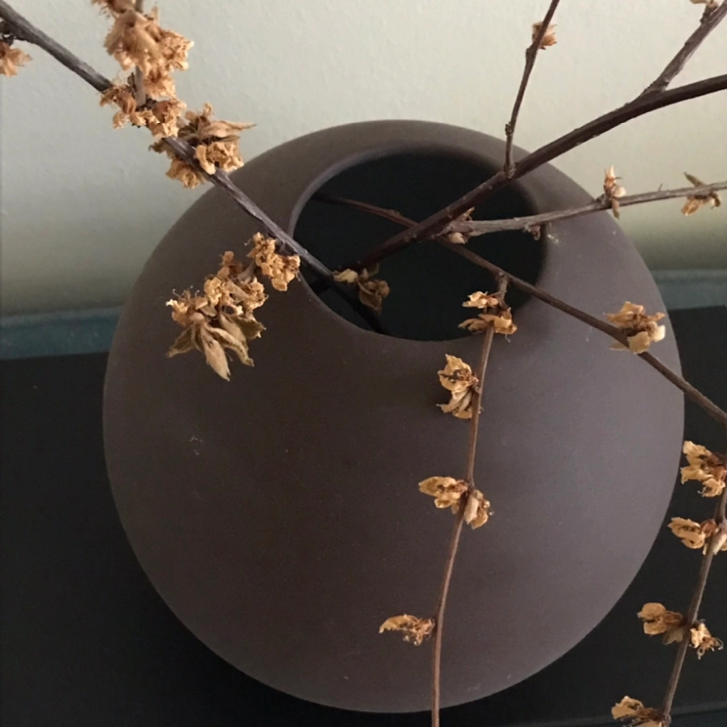 A sleek, sphere-shaped ceramic vase. It is an elegant, ‘thin’ ceramic, as opposed to thick, in a lovely chocolate brown exterior & soft pastel blue interior.